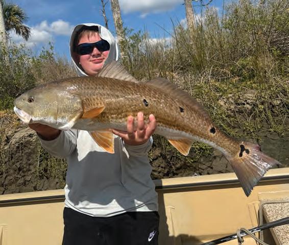 I was just telling my clients one day last week, a er catching a bunch of small trout and a couple of lady!sh, that the big uglies were probably going to show up in a few weeks and if they had a chance to come back out with me then that they may have a shot at catching some much larger !sh than the ones we had landed that morning. Just !ve minutes a er saying this I spotted something unusual about 500 yards up the at. It was exactly what I had just been talking about- a 300 !sh school of 30 to 50-pound black drum.