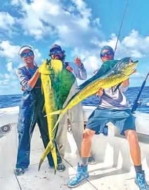 In addition to Wahoo and Blackfin Tuna, I expect to see some early season Mahi. If Tuna and Wahoo are your target , best start is on the shelf edge. Tuna and Wahoo love to hold on structure. For Tuna long monofilament leaders with naked ballyhoo or the triedand-true cedar plug is the way to go. I like 80# mono and Blue and white being my color choice. I like to mix in some wire riggs for the inevitable Wahoo bite. Mid-morning I start looking to the east anticipating an edge that will be holding Mahi / Dorado
