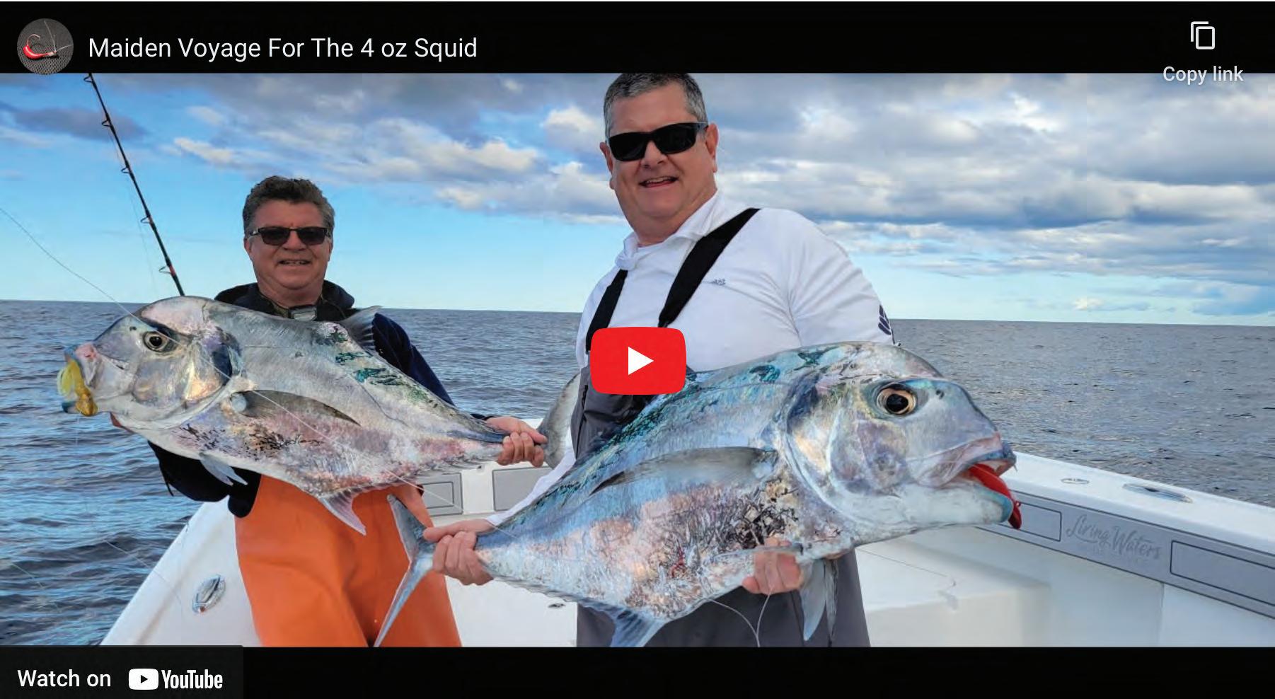 Barefoot uses 40-pound braid to an 80-pound fluorocarbon leader. He ties on his jig with a loop knot. The thing about squid is fish always hit them from behind in order to disable the sharp beak in the middle of their tentacles. Barefoot said African pompano, as well as grouper and many other species, almost always take the squid jig deep, and the result is a solid hook set in the mouth.