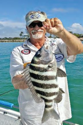Tiny crabs or sand feas will produce great sheepshead action. Live shrimp cut in half are my next “go to” bait. Seek docks with at least eight feet of water (10’ to 14’ is ideal). Cast to the base of the pilings. Ten tighten the line to feel the bite.