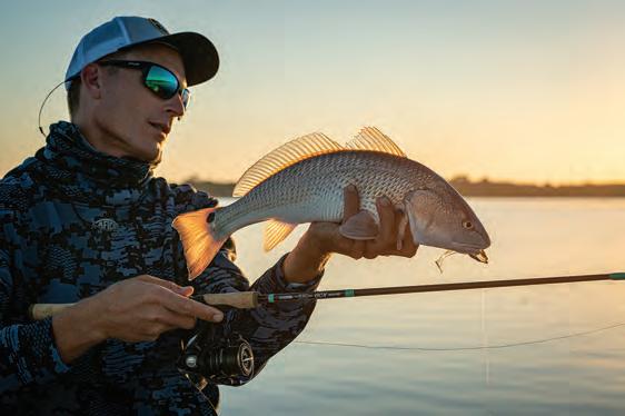 • When a sh swims or is pushed by waves or current into a snag-prone area, it’s o en counter productive to crank down and pull directly against the sh. Pulling hard works OK on small or mediumsized sh, but with larger sh I like to angle the rod horizontally and