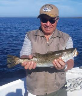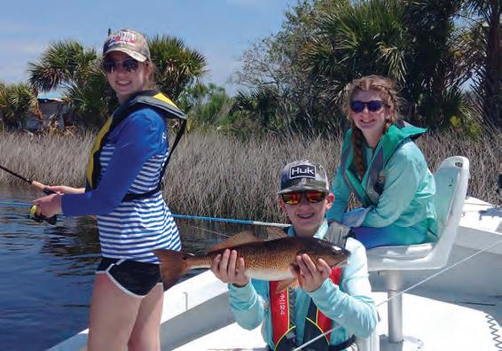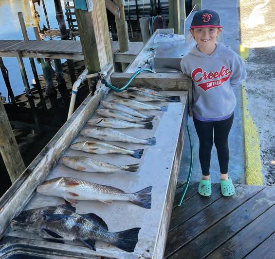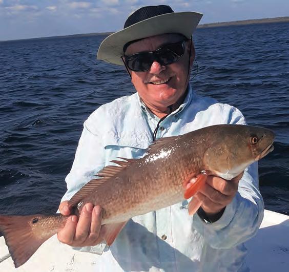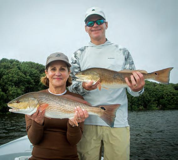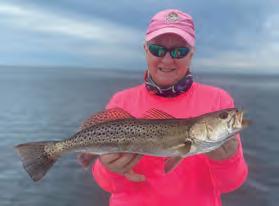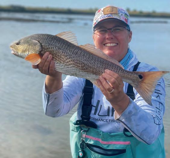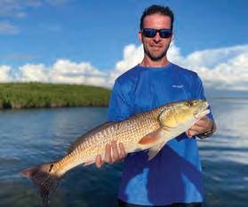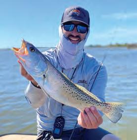 bait ushed from the bays with the dropping tides are followed by hungry specks and reds. In these situations, I like to use a smaller lure. Generally, they feed on shrimp or smaller bait sh, and having a lure of similar size is a good idea. When they are following these schools, I like non-natural colors so the sh have something to key in on when bait is abundant. I like my lure’s color to stand out in the fall feeding frenzy.