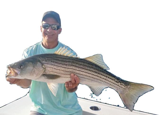 At the same time, big schools of striped bass will be marauding bait sh on the beaches and in the inlets. Surf anglers can encounter them blitzing menhaden by looking for bait and birds. Charter boats do good business this time of year trolling while keeping eyes peeled for stripers herding and crashing bait balls.