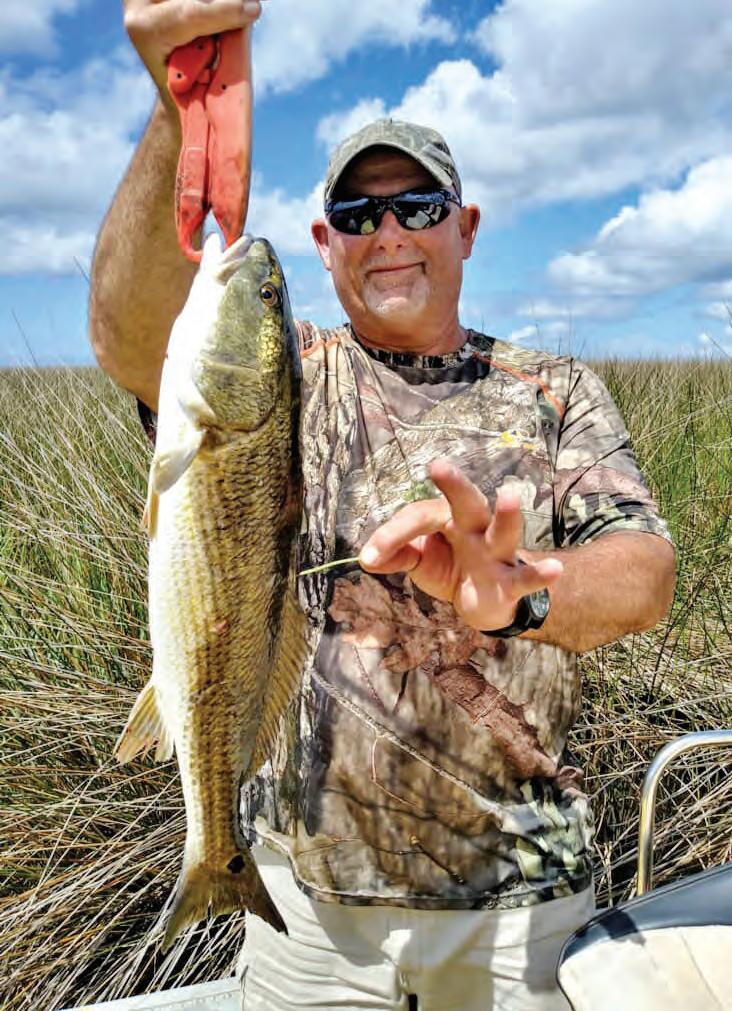 When the tide is slow, I like to try and get a reaction strike by throwing something a little di erent or working my lure erratically. On this day, I was throwing a rattling so -plastic paddletail. I also picked one with a bright green tail to stand out from the millions of bait sh traveling the rst and second guts. All of these tactics combined allowed me to salvage a day when most le with empty stringers.