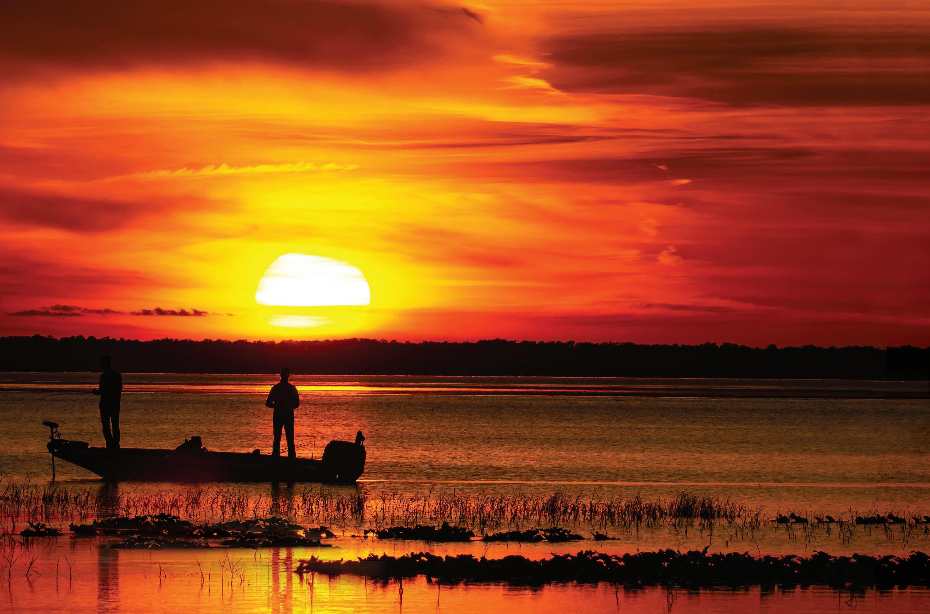 When full moons and 60-degree water temps coincide, bass move onto the ats. ey spawn in waves. Spawning sh select isolated hydrilla clumps, reeds and the bases of pad stems to fan out beds. Hard sand bottom is key. Use sonar to locate hard bottom or stick your rod tip into the water to feel the bottom. If your rod tip pushes into mud, keep moving until you nd sand and then search for isolated cover.