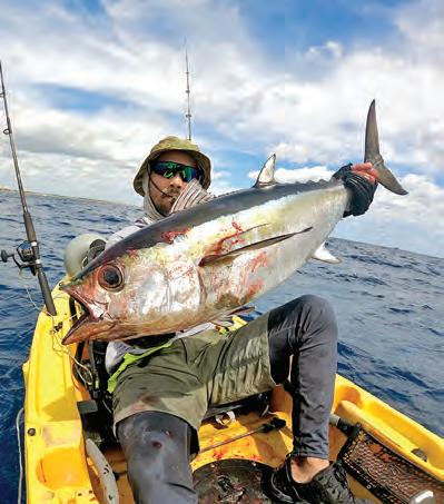 I fsh early mornings, as tuna can be both light and boat shy. During a full moon cycle, the bite can turn of quickly as the fsh have been feeding most of the night. Once on my target area, I set up for a drif just outside the frst reef system, past the drop-of in deeper water to avoid bonito, sharks and kingfsh. Tis is typically in the 225- to 300-foot range. I deploy two live baits—one in the bow and the other in the stern—then jig in the middle. Check your fshfnder ofen to identify “scratches,” or fsh moving through, and mark the depth they appear in the water column. Target these fsh while jigging.