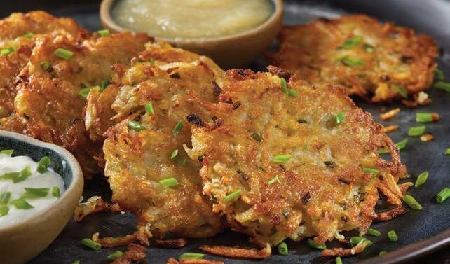 Usingafoodprocessorwithacoarsegratingdisc,gratethepotatoesandonion. Transferthemixturetoacleandishtowelandsqueezeandwringoutasmuchofthe liquidaspossible.Workingquickly,transferthemixturetoalargebowl.Addtheeggs, flour,salt,bakingpowderandpepper,andmixuntiltheflourisabsorbed.Ina mediumheavy-bottomedpanovermedium-highheat,pourinabout¼inchoftheoil. Oncetheoilishot(adropofbatterplacedinthepanshouldsizzle),useaheapingtablespoontodropthebatterintothehotpan,cookinginbatches.Useaspatulatoflattenandshapethedropsintodiscs.Whentheedgesofthelatkesarebrownandcrispy, about5minutes,flip.Cookuntilthesecondsideisdeeplybrowned,aboutanother5 minutes.Transferthelatkestoapapertowel-linedplatetodrainandsprinklewithsalt whilestillwarm.Repeatwiththeremainingbatter.