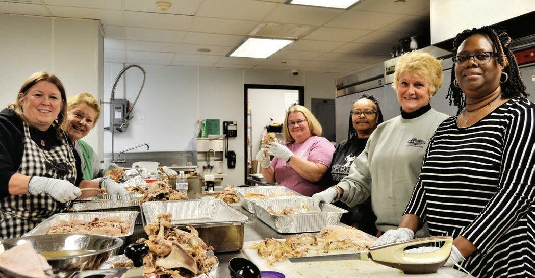 BlessingsforBadgesvolunteerspreparethe turkeyforthemealsthatwillbedeliveredto first-respondersacrossSussexCountywhoare workinginsteadofspendingtheThanksgiving holidaywiththeirfamilies.Shown,clockwise fromfront-left,are:LisaMcFey,CaroleWard, AndreaFinkbiner,SharonTaylor,LisaO’Neal andMaryCurtis.