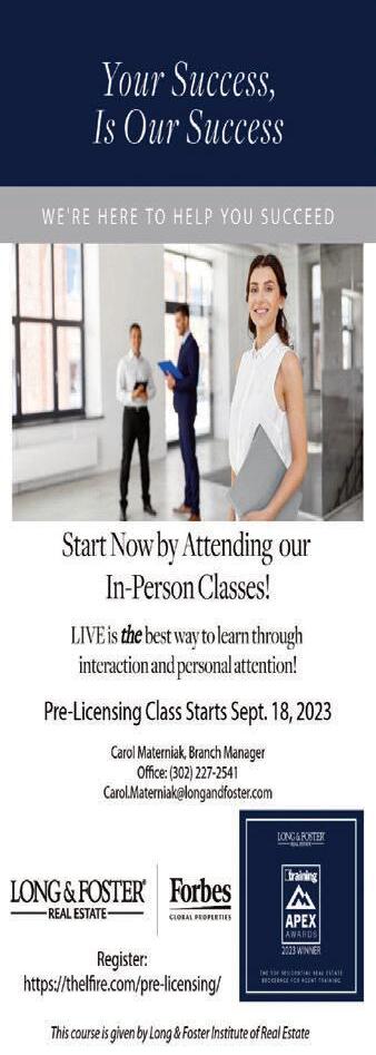 96 CoastalPoint August11,2023 For a con dential interview about starting your Real Estate Career call us today! Carrie Cosgrove (c) 302-339-5519 • Email: ccosgrove@kw.com | Mary Niles (c) 302-228-5143 • Email: Marycniles@kw.com 31252 American Pkwy. Selbyville, DE 105 High St. Seaford, DE 37169 Rehoboth Ave. #11 Rehoboth Beach, DE 39682 Sunrise Ct. Bethany Beach, DE 35238