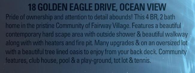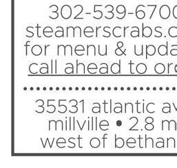 Fairway Hearing! Veteran Owned and Operated Stay in the game witha clear path to better hearing. 302-537-2433 | 121 Campbell Place Bethany Beach | patsysgourmet.com Key West & Creative Coastal Cuisine • Everything Freshly Made In House Open Thursday - Tuesday at 5:30pm Closed Wednesday ❖ Whole Flash-Fried Snapper ❖ ❖ 14oz. Bone-In Pork Chop ❖ All Natural NY Strip Steaks ❖ ❖ Cioppino ❖ Shrimp & Grits ❖ Gluten-Free & Vegetarian Available 29P Atlantic Ave. • Ocean View, DE 302.616.2604 • OceanVayuYoga.com Ocean Vayu Yoga Beach Yoga Saturdays & Sundays 7:30-8:30am Central Blvd., Bethany Beach Alpaca Yoga At Four Acres Farm!! 9/16, 9-10am, Cost is $25 Yoga Teacher Training Starts 10/7 LOCAL ART • VINTAGE UNUSUAL • ANTIQUE ARCHITECTURAL SALVAGE 302.927.0049 On the corner, south of the stoplight 33034 Main St., Dagsboro Call or Follow us on Facebook and Instagram or email: jaynesreliable@gmail.com OPEN Fri-Sun 10–4pm