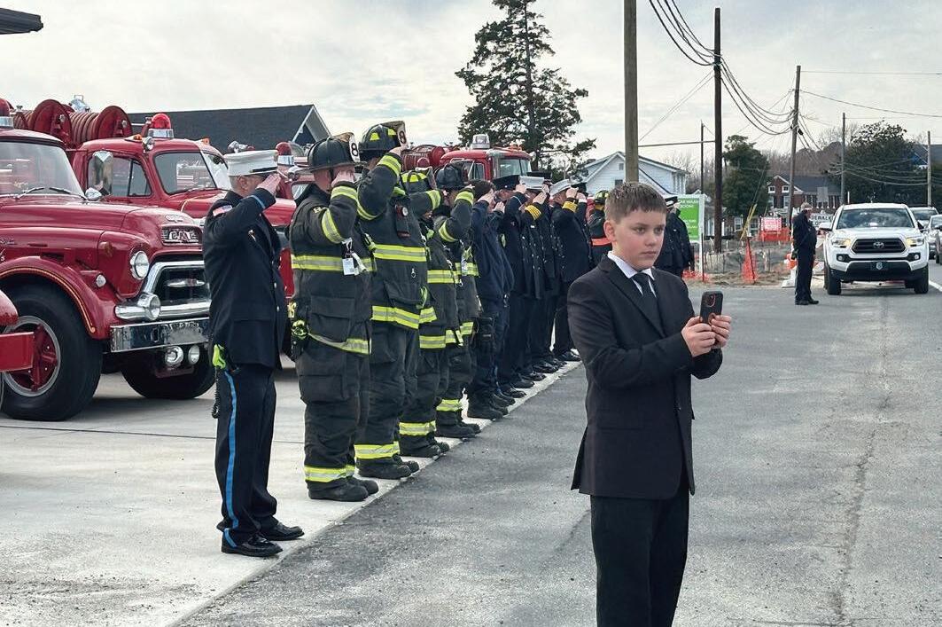 GreydonHockerwatchesandmembersoftheMillvilleVolunteerFireCompanystandandsaluteasthefuneralprocessionfor formerstateSenatorandhonoraryfirecompanymemberGeorgeH.BuntingJr.passesbyonSaturday,Feb.21.Greydonisthe sonoffirecompanypresidentGregoryHocker.