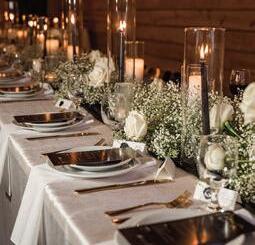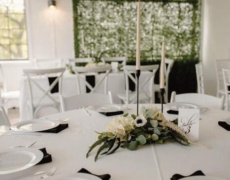 Aclassicblackandwhitepalettewilltakeyou farinthechillymonths.Loaduponwhiteflorals,candles,greenery,andpopsofgold.Keep yourguestscomfortablewithcozylounge areasdrapedinsoftblanketsandlooktostylishmobilebarstoservewarmbeverageslike spikedhotchocolate,ciders,andmore!