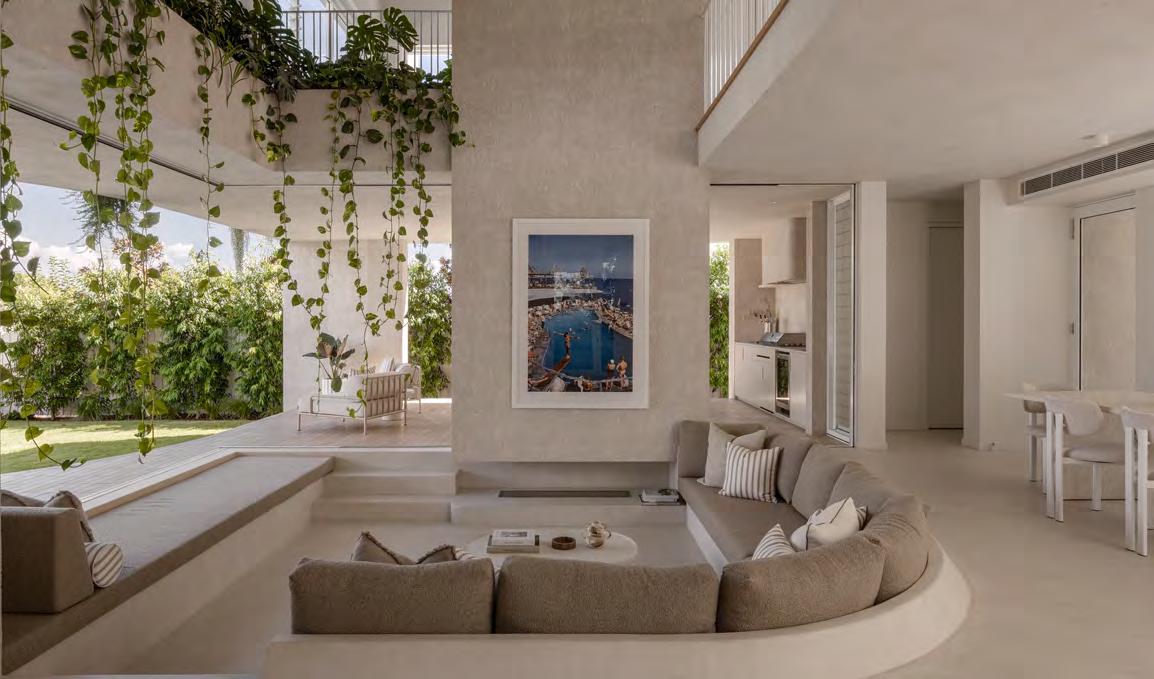 At the heart of the residence, a serene wellness courtyard anchored by a mature olive tree creates a private sanctuary, where soft architectural forms and ambient lighting evoke the calm atmosphere of a refined resort retreat.