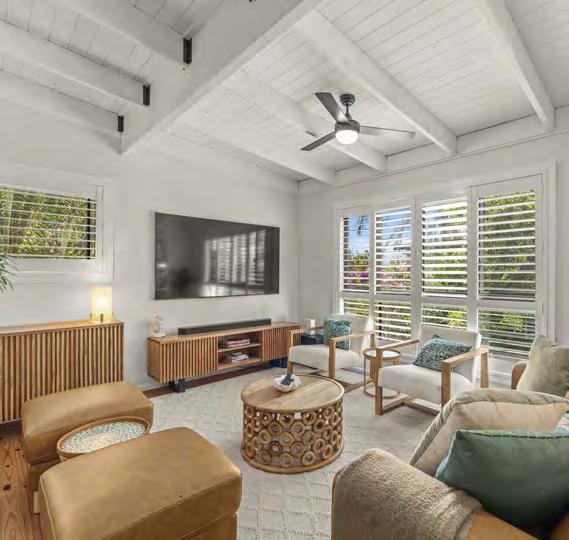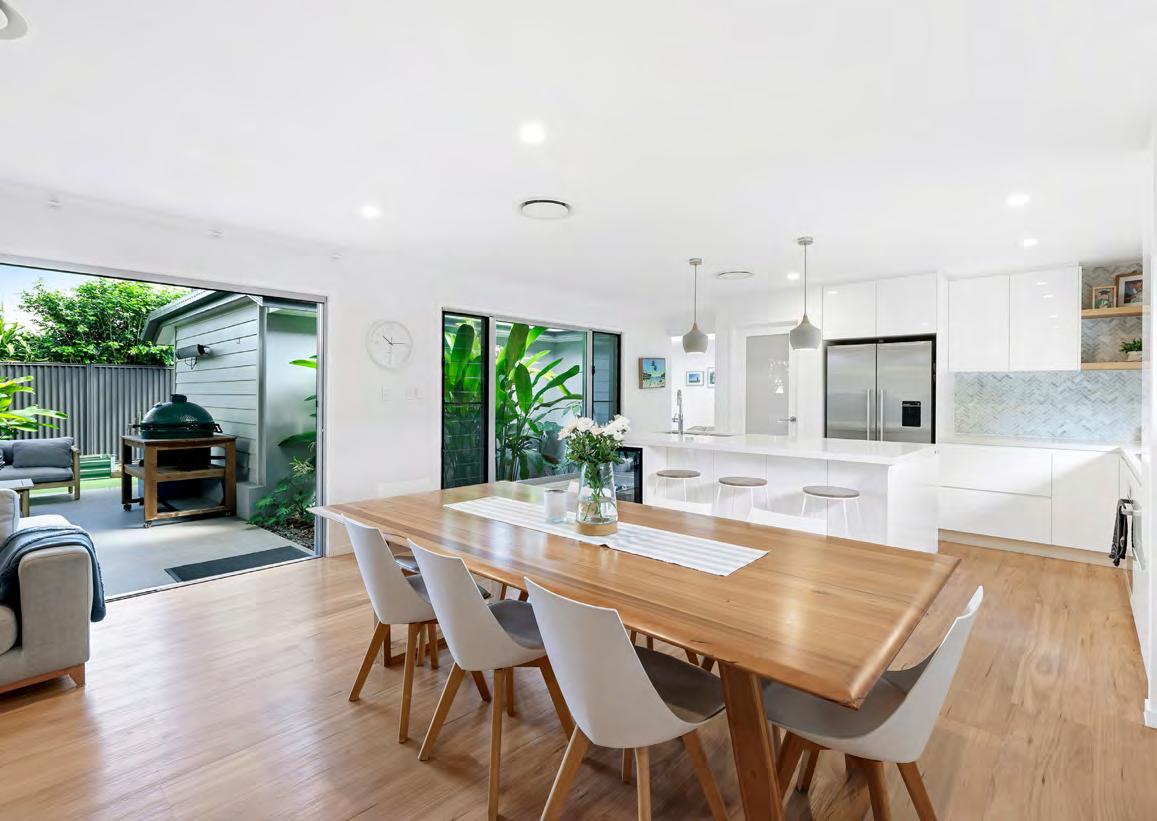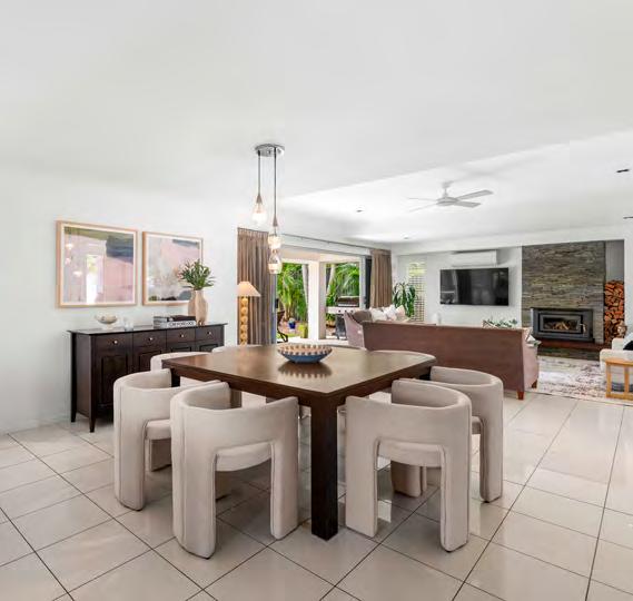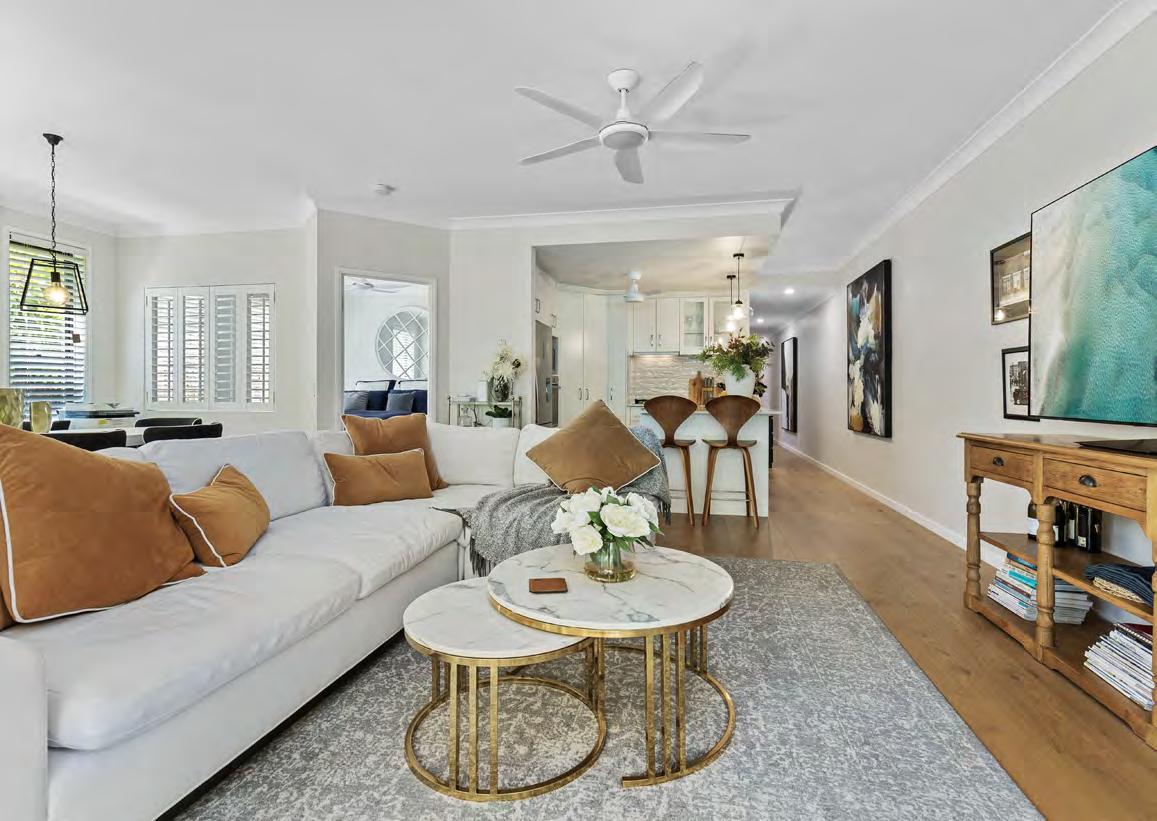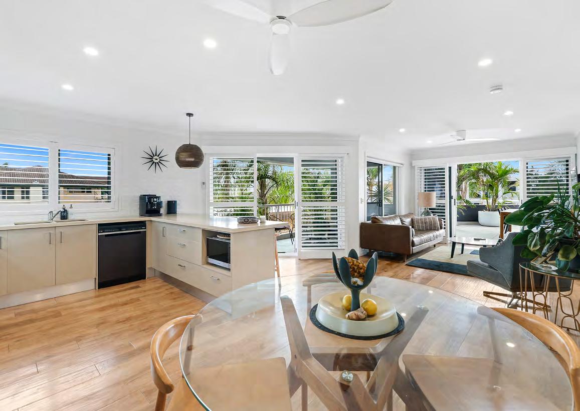 Defined by soaring 3 metre ceilings and a sequence of expansive yet inviting living spaces, the home unfolds with a natural rhythm where volume, texture and light work together to create interiors that feel both elevated and deeply liveable. Plantation shutters soften coastal light across the day, while carefully resolved detailing reflects a level of craftsmanship rarely seen among original Casuarina homes.