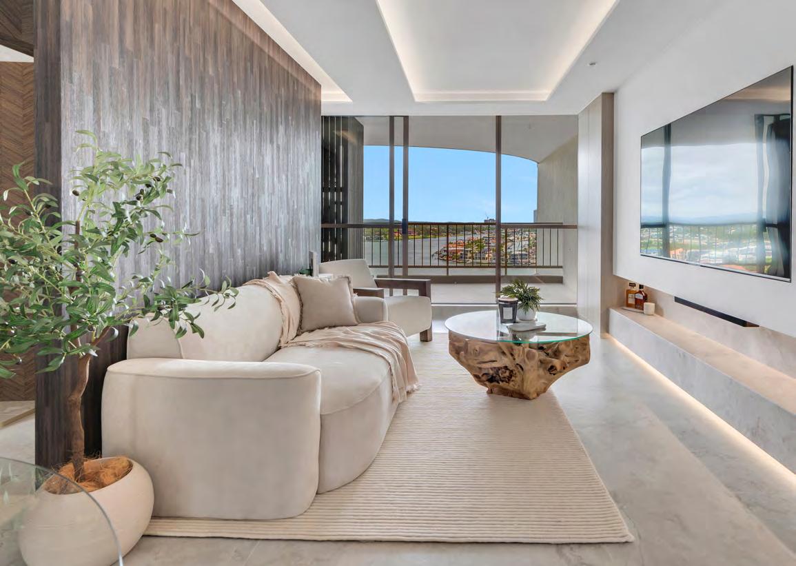 Positioned high on Level 18 within the architecturally striking Remi Residences, Residence 1801 presents a rare opportunity to secure one of the building's most desirable half-floor residences, offering an expansive 218sqm of sophisticated coastal living in the heart of Broadbeach. Enjoying a prized north-facing aspect, the residence is filled with natural light and cooling coastal breezes thanks to the extra high 2.8m ceilings throughout while opening onto oversized protected entertaining balconies designed for year-round outdoor living.