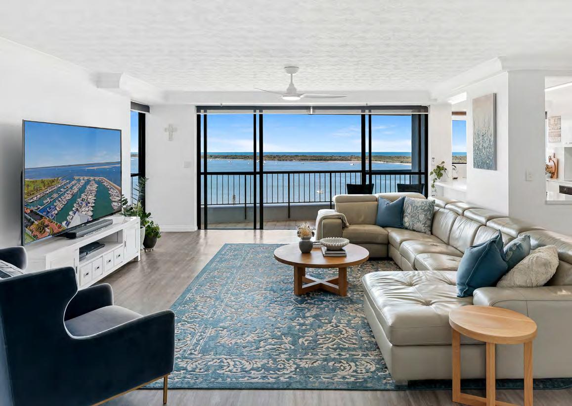 Live above it all in this top-lfoor, north-facing penthouse-style apartment, delivering a spectacular panorama spanning the canals, the Broadwater and the hinterland in one breathtaking outlook The epitome of luxury and privacy, located on the eighth lfoor, this light and bright home offers an open-plan living and dining area and features lfoor-to-ceiling screen and glass doors for seamless indooroutdoor living
