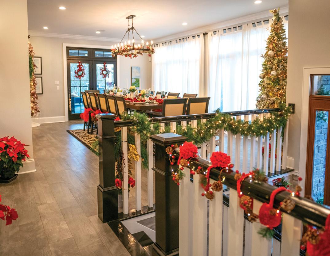 Green is Bernard’s favorite color, and holiday decor always incorporates the hue. She also focuses mostly on displaying decor collected over the years. “It is inspired by my kids and grandchildren,” she said, pointing to whimsical gingerbread houses and candy trees. By the mantle where seven stockings hang is a Chesapeake Bay “crabby tree,” with old-world ornaments collected from travels. Bernard also works in family photographs and decorates a garden tree — her favorite pastime, aside from enjoying family. “I like things that bring smiles to their faces,” she said. CS