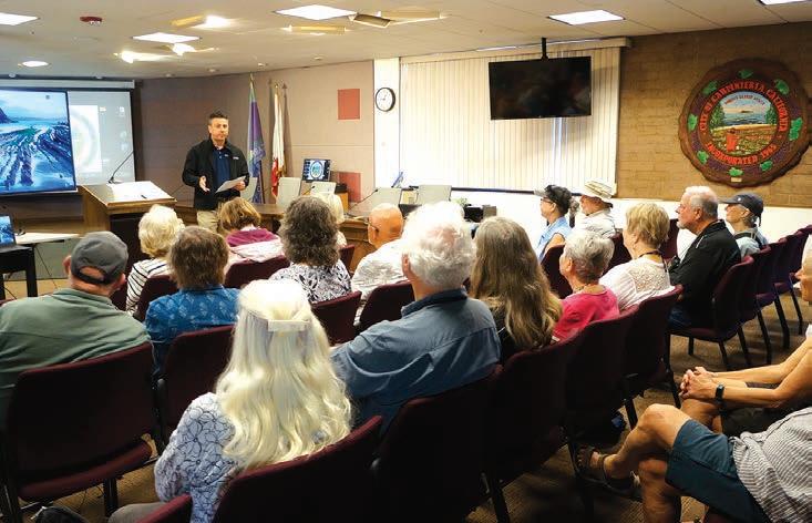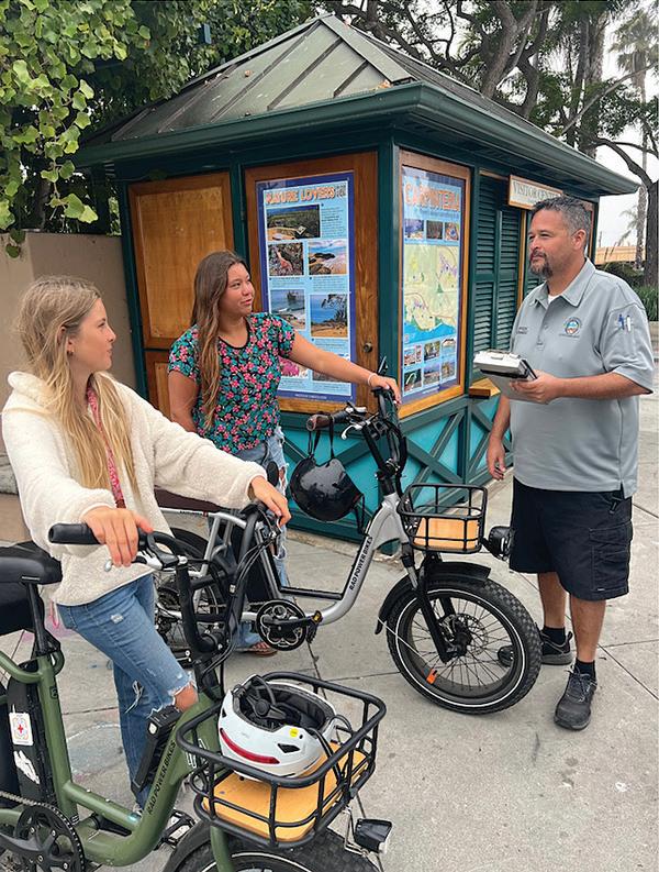 City of Carpinteria Code Compliance Supervisor David Hernandez speaks with two e-bike riders as part of the city s education- rst rollout of updated regulations governing e-bikes and motorized scooters, now in effect in the downtown area.