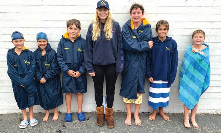 From left to right, Tritons swimmers Sammi Walker, Skyler Graehl, Joaquin Smith, coach Lexi Persoon, Frankie Stewart, James Melton and Billy Stewart.