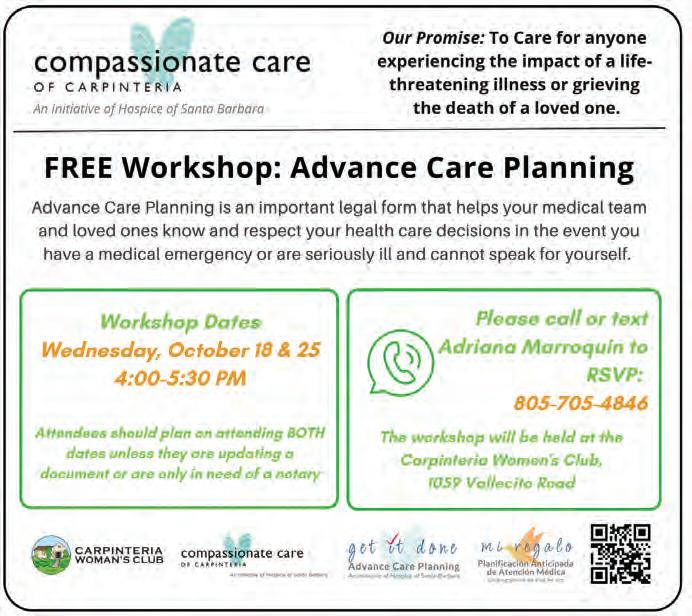 Hospice of Santa Barbara will host a free Advance Care Planning Workshop at the Carpinteria Woman’s Club on Oct. 18 and Oct. 25, 4–5:30 p.m. The workshop will include raffle prizes and free notary work for all participants. Learn more by emailing communityacp@hospiceofsb.org or by calling (805) 705-4846.