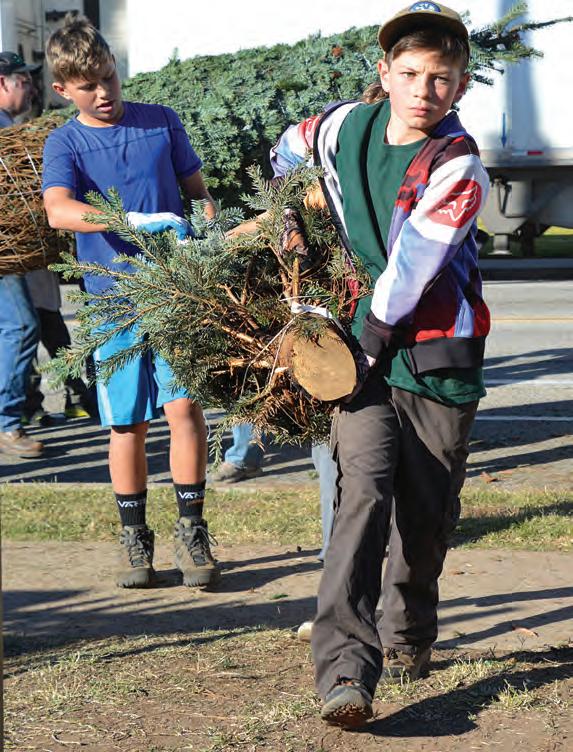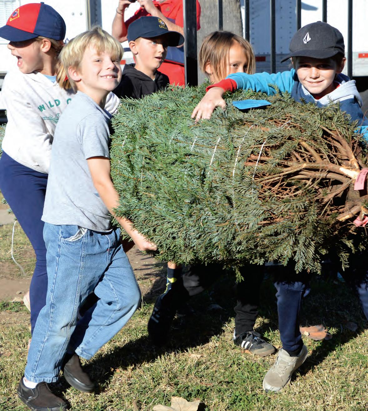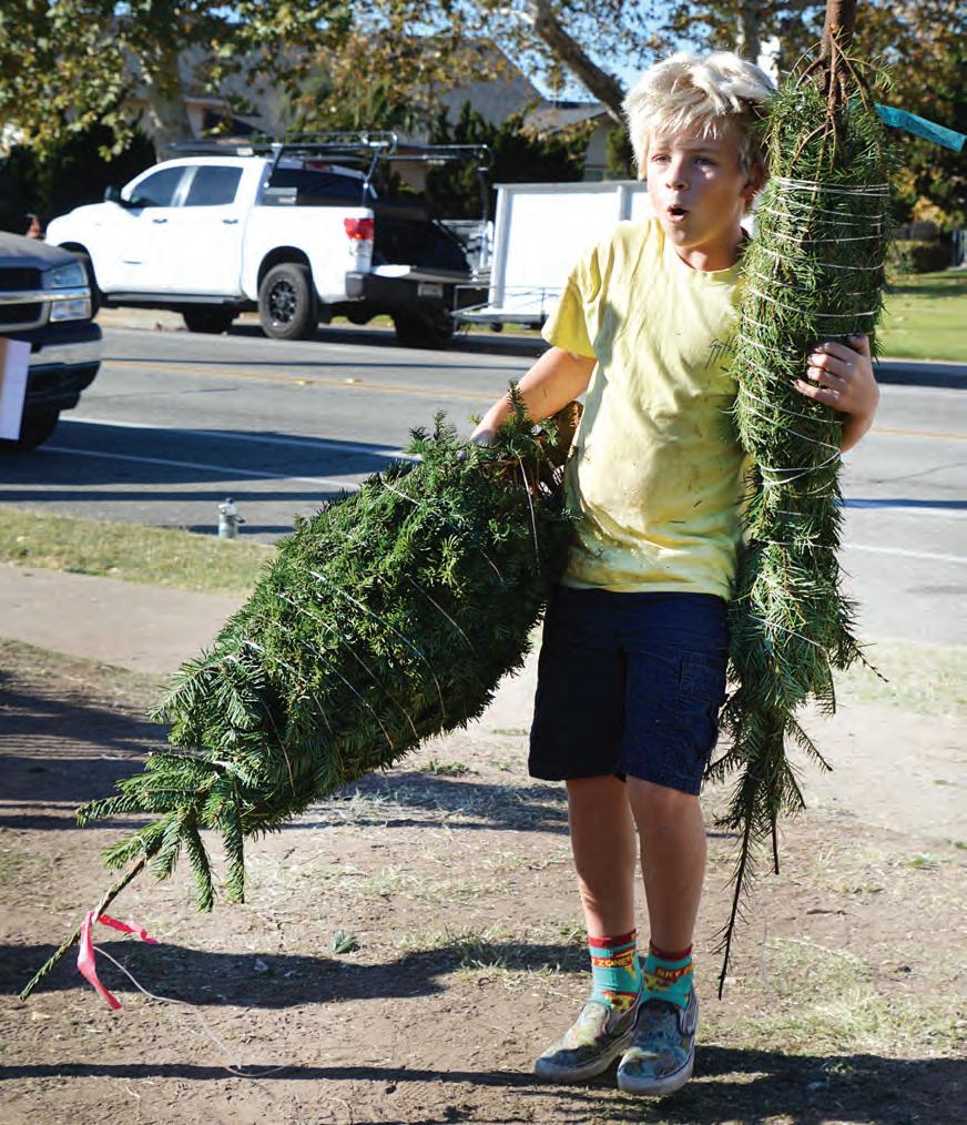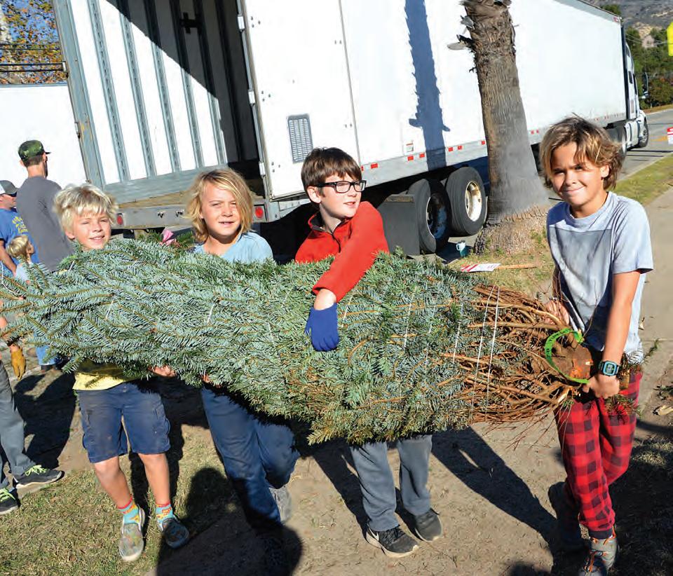 From left, Ada Fedders, Finn Oliver, Tate Mayer, Crosby Bass and Reese Isaac carry a large Christmas tree into the Boy Scouts' annual Christmas Tree lot. On Saturday, the young troops dragged over 800 trees out of two trucks hailing from Oregon, setting them up in the lot and preparing them for purchase; the lot is open at St. Joseph Church in Carpinteria, at