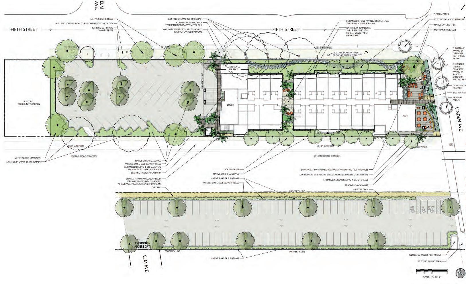 ABOVE: Proposed plans show the Surfliner Hotel and an attached public parking lot at 499 Linden Ave.