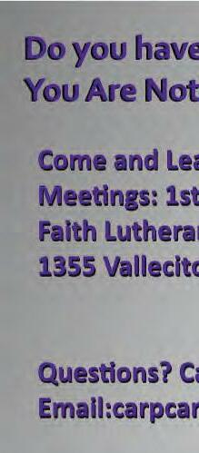 NOW OPEN IN CARPINTERIA WWW.MULWEBPT.COM Offering Home Health, Outpatient and Aquatic Physical Therapy in Santa Barbara for 40+ years MULLER & WEBER Santa Barbara 2324 Bath Street, Suite A Santa Barbara, 93105 805.682.3870 MULLER & WEBER Carpinteria 1110 Eugenia Place, Suite A Carpinteria, 93013 805.318.9393 MULLER AQUATIC CENTER Santa Barbara 22 Anacapa St. Santa Barbara, 93101 805.845.1231 David Lewis Christmas Eve Candlelight Service 1335 Vallecito Place (corner of Ogan Rd) 805.684.4707 www.FaithCarpinteria.org Christmas Day - No Service Join us at 5:30 pm “PRINCE OF PEACE” Hear the message of Christmas Angels FAITH LUTHERAN CHURCH Faith Lutheran Church ~ Vallecito Place at Ogan Road Questions? 805-881-3255 • carpcaregivers1@gmail.com Carpinteria Alzheimer’s Caregiver Support Group Do You Have a Family Member with Memory Problems? You Are Not Alone - We Can Help. “Come and Learn Caregiver Tips & Tools” MEETINGS Wednesdays, 2-4pm