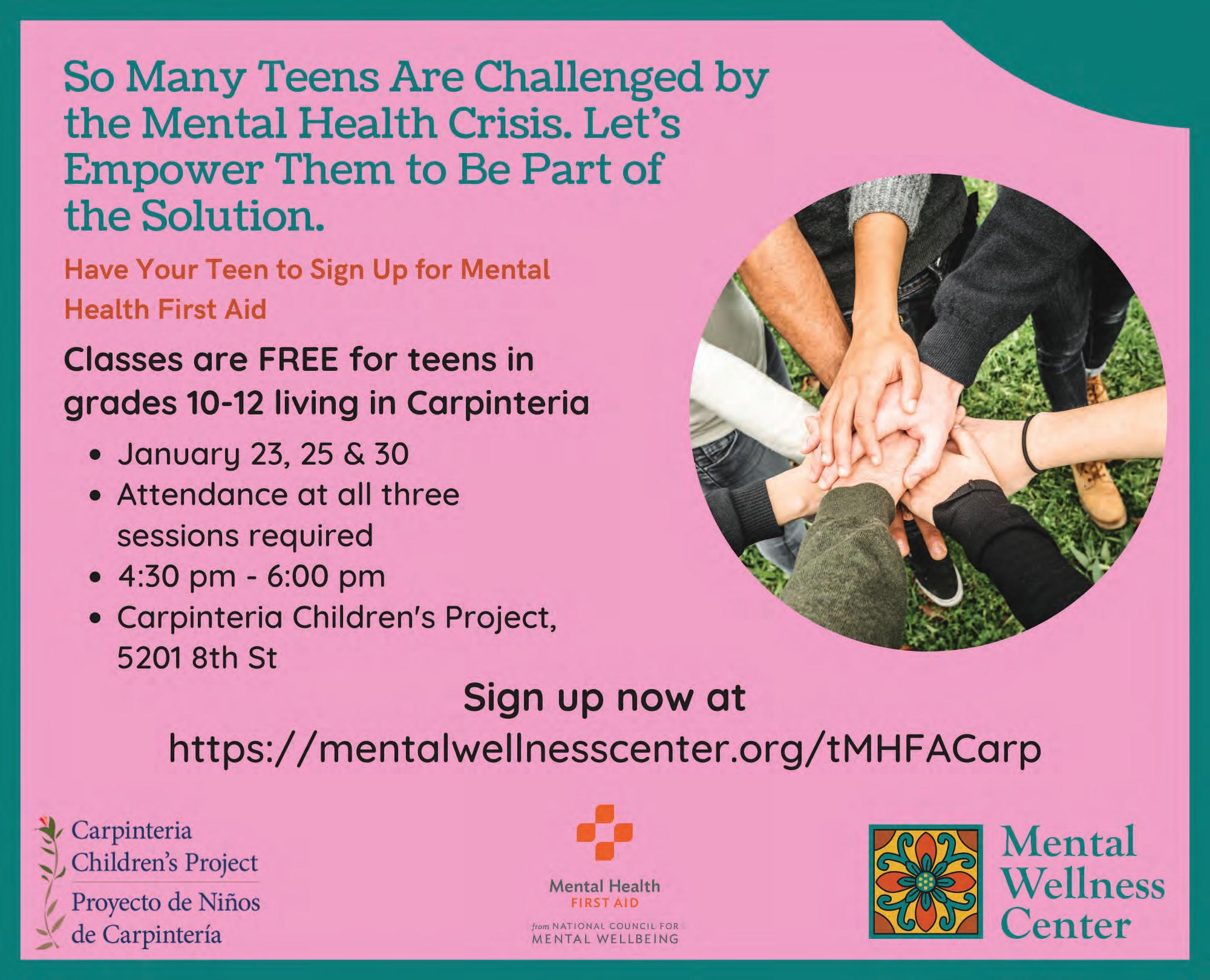 This 10-week drama class, designed to help CMS students identify and articulate their feelings through a creative outlet, will begin Wednesday, Jan. 18 in the Multi-Purpose Room of the middle school. Classes will culminate in a performance at The Alcazar Theatre, led by instructor Asa Olsson. Registration available at the CMS office or during the first day of class. Wednesday, Jan. 18. 1:30–3:30 p.m.