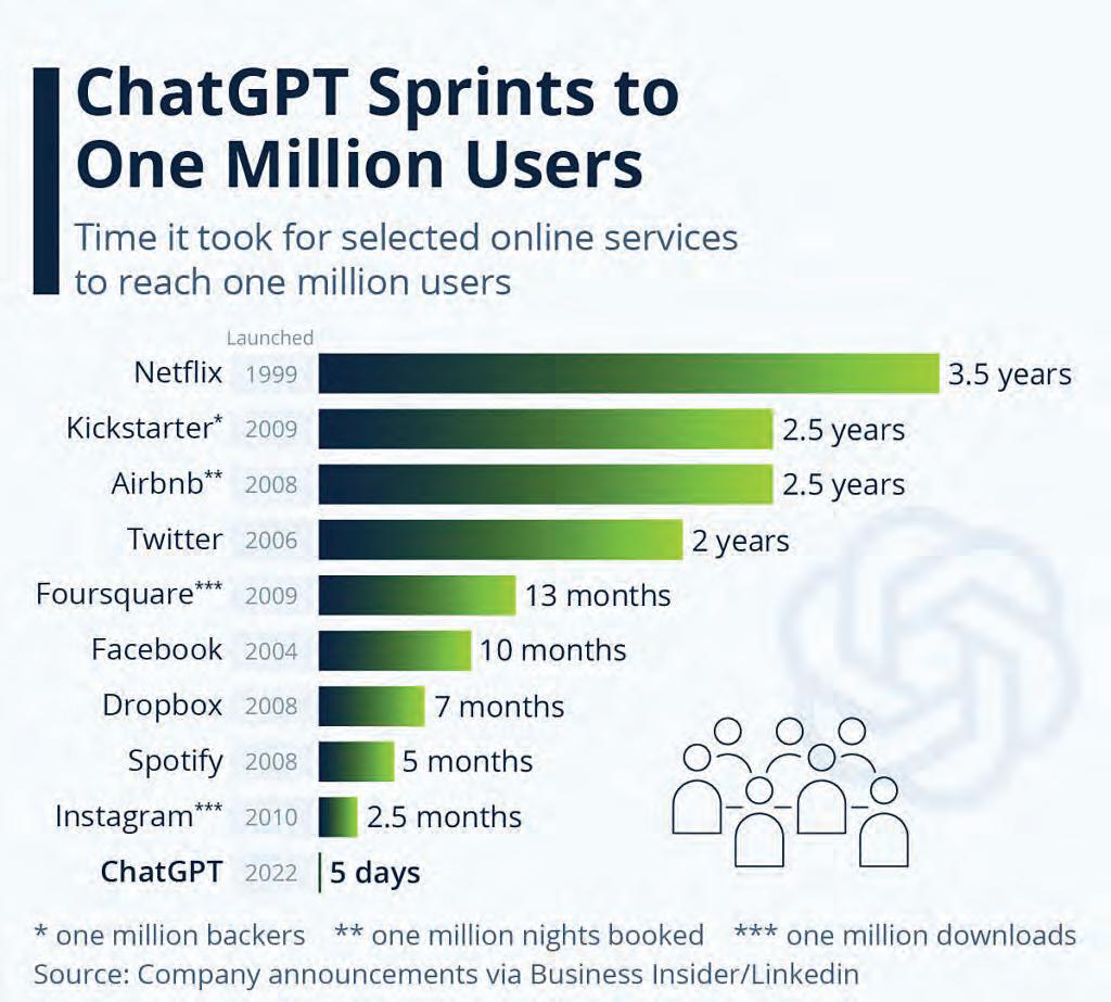 It took five days for ChatGPT to reach one million users, according to the company’s announcement on LinkedIn.