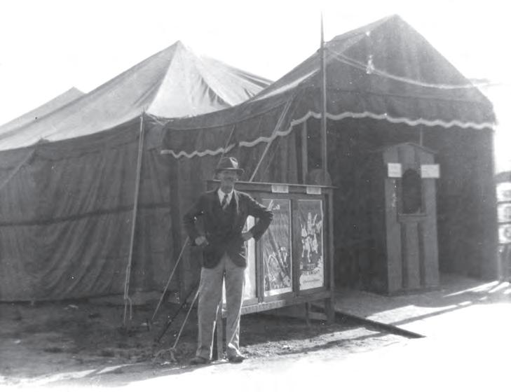 Ollie Prickett stands in front of the Carpinteria theater that operated out of a circus tent, ca. 1928.