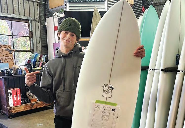 Wyatt Pitterle shows off a surfboard, one of the raffle prizes for the Carpinteria Surf Team’s movie night fundraiser on April 19.
