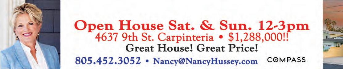 32 Thursday, October 13, 2022 Coastal View News • Carpinteria, California Thinking of Selling Your Property? FREE MARKET EVALUATION CALL SHIRLEY KIMBERLIN TODAY! 805-886-0228 ENJOY THE BEACH LIFESTYLE... Delightful condominium located just steps across the street from the “WORLD’S SAFEST BEACH” and NATURE PARK PRESERVE. Two bedrooms, two bathrooms, private deck with estuary and mountain views. Amenities include two swimming pools, spa, laundry room and gated parking. A perfect unit to enjoy full-time, or as a vacation retreat that can be rented weekly or monthly. Great on-site management. OFFERED AT $1,150,000 Please call Shirley Kimberlin at 805-886-0228 Buying or selling a home with us is like a walk on the beach! Seascape Realty View our properties for sale at Look4SeascapeRealty.com Shirley Kimberlin Seascape Realty Sylvia Miller (805) 448-8882 BRE Lic#: 00558548 Is Proud To Welcome Sylvia's vast experience and innovative marketing strategies help Sellers get the highest possible price in the shortest possible time. And, her complete representation for Buyers can help you realize the perfect home to meet your needs. Sylvia's reputation for outstanding customer service makes herTHE RIGHT REALTOR® FOR YOU TM www.santabarbaraconnection.com - sylvia@sanbarb.com Sylvia MillerTerry Stain Nancy Branigan Betty LloydGeorge Manuras Diana Porter 4915-C Carpinteria Ave. • 805.684.4161 BRE Lic. #01484280