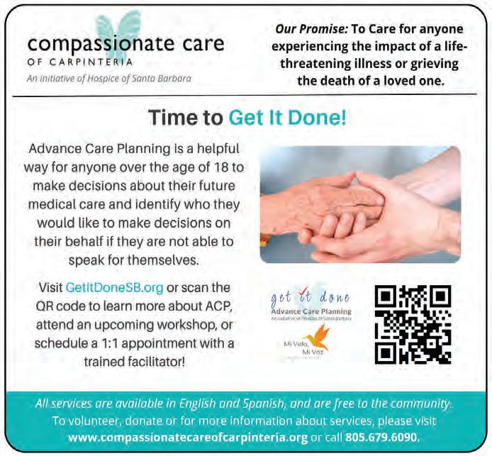 6:30-8 pm Annual Candlelight Vigil Invites You! SUNDAY, SEPTEMBER 10 Lynda Fairly Carpinteria Arts Center 865 Linden Ave., Carpinteria FDI-1867L-A © 2022 EDWARD D. JONES & CO., L.P. ALL RIGHTS RESERVED. AECSPAD > edwardjones.com | Member SIPC Call or visit your local financial advisor today. Compare our CD Rates Bank-issued, FDIC-insured % APY* % APY* % APY* * Annual Percentage Yield (APY) effective 09/01/2023. CDs offered by Edward Jones are bank-issued and FDIC-insured up to $250,000 (principal and interest accrued but not yet paid) per depositor, per insured depository institution, for each account ownership category. Please visit www.fdic.gov or contact your financial advisor for additional information. Subject to availability and price change. CD values are subject to interest rate risk such that when interest rates rise, the prices of CDs can decrease. If CDs are sold prior to maturity, the investor can lose principal value. FDIC insurance does not cover losses in market value. Early withdrawal may not be permitted. Yields quoted are net of all commissions. CDs require the distribution of interest and do not allow interest to compound. CDs offered through Edward Jones are issued by banks and thrifts nationwide. All CDs sold by Edward Jones are registered with the Depository Trust Corp. (DTC). Aaron P Crocker Financial Advisor 5320 Carpinteria Ave Suite J Carpinteria, CA 93013 805-684-8470 6-month 9-month 5.30 5.30 1-year 5.40 montecito.bank/mortgage•(805) 963-7511 We’re the key to homeownership. Apply Today We have the financing options to make your new home a reality! Mortgage & Home Lending