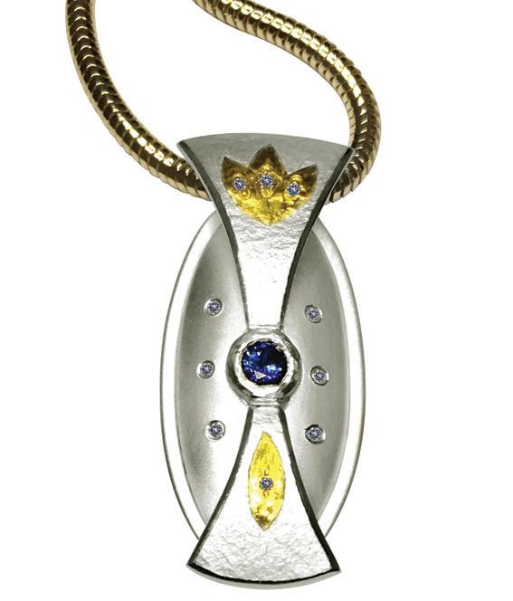 This pendant has an 18ct yellow gold and silver twist around the pure silver and pure gold centre, which contains 0.08ct of diamonds. It’s available in Peridot, Shy Blue Topaz and Rhodolite Garnet. $1,660.00
