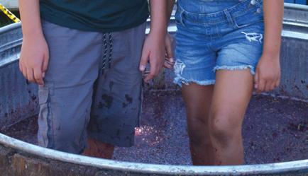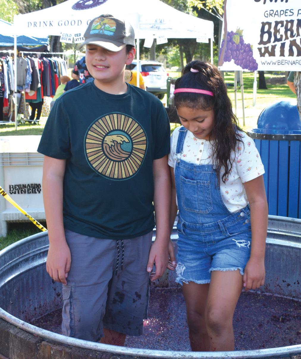 GRACE AND SEBASTIAN, top, learn how to make wine the traditional way by stomping on grapes at Escondido’s Grape Day Festival. Above, guitarist Melody Maker of the Silk Button Butchers performs. Photos by Samantha Nelson