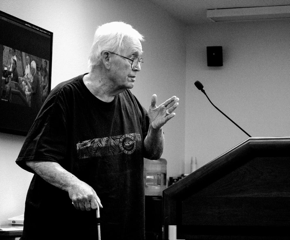 ERIC ‘BIRD’ HUFFMAN, proprietor of Bird’s Surf Shed in San Diego, shown at the 2021 Luau & Legends of Surfing Invitational. File photo/Chris Ahrens