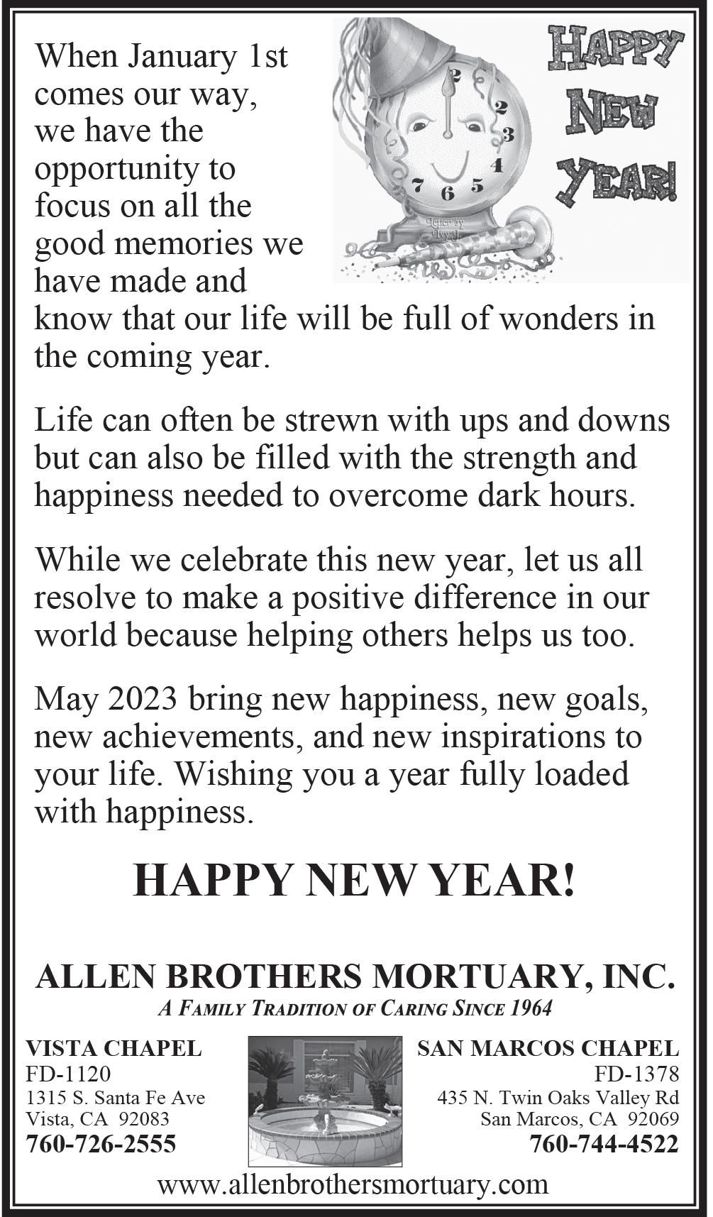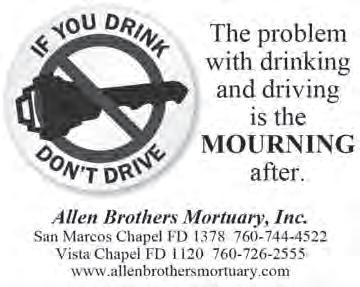 December 16, 2022 Share the story of your loved ones life... because every life has a story. or email us at: obits@coastnewsgroup.com 760.436.9737 For more information call “Death leaves a heartache no one can heal, love leaves a memory no one can steal.” — Irish proverb Submission Process Please email obits @ coastnewsgroup.com or call (760) 436-9737 x100. All photo attachments should be sent in jpeg format, no larger than 3MB. the photo will print 1.625” wide by 1.5” tall inh black and white. Timeline Obituaries should be received by Monday at 12 p.m. for publicatio in Friday’s newspaper. One proof will be e-mailed to the customer for approval by Tuesday at 10 a.m.