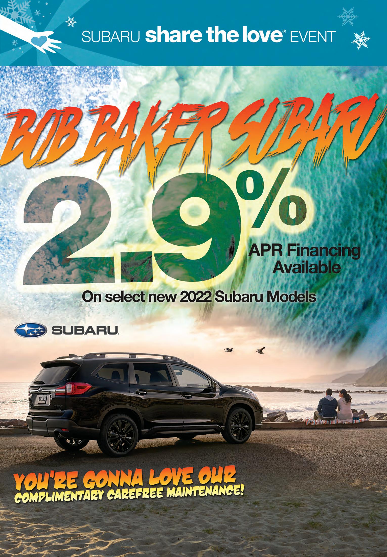 32 T he C oas T N ews DEC. 30, 2022 (760) 438-2200 ** EPA-estimated fuel economy. Actual mileage may vary. Subaru Tribeca, Forester, Impreza & Outback are registered trademarks. All advertised prices exclude government fees and taxes, any finance charges, $80 dealer document processing charge, any electronic filing charge, and any emission testing charge. Expires 1/1/2023. Purchase or lease any new (previously untitled) Subaru and receive a complimentary factory scheduled maintenance plan for 2 years or 24,000 miles (whichever comes first.) See Subaru Added Security Maintenance Plan for intervals, coverages and limitations. Customer must take delivery before 12-31-2022 and reside within the promotional area. At participating dealers only. See dealer for program details and eligibility. C ar Country Drive C ar Country Drive No down payment required. Other rates and payment terms available. Cannot be combined with any other coupon, direct/email offer or promotional offer unless allowed by that offer. Financing for well-qualified applicants only. Length of contract is limited. Subject to credit approval, vehicle insurance approval and vehicle availability. See dealer for details. Must take delivery from retailer stock by January 1, 2023. 5500 Paseo Del Norte Car Country Carlsbad Bob Baker Subaru wants to thank our customers for helping be a part of over 2800 Pet Adoptions with the Rancho Coastal Humane Society! Subaru will donate $250 for every new Subaru vehicle sold or released from November 17, 2022, through January 3, 2023. CoastNews_12_30_22.indd 1 12/26/22 9:19 AM