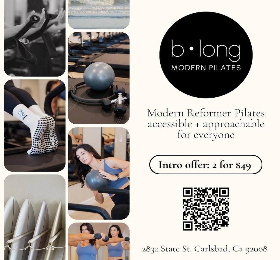 Liz, who also owns b∙long Modern Pilates in Coronado along with other tness studios, says Pilates transformed her body in ways marathon running, triathlons, and Spartan races never did. While traditional strength training often targets large muscle groups, it can overlook the smaller stabilizing muscles that support alignment and functional movement. Pilates lls that gap.