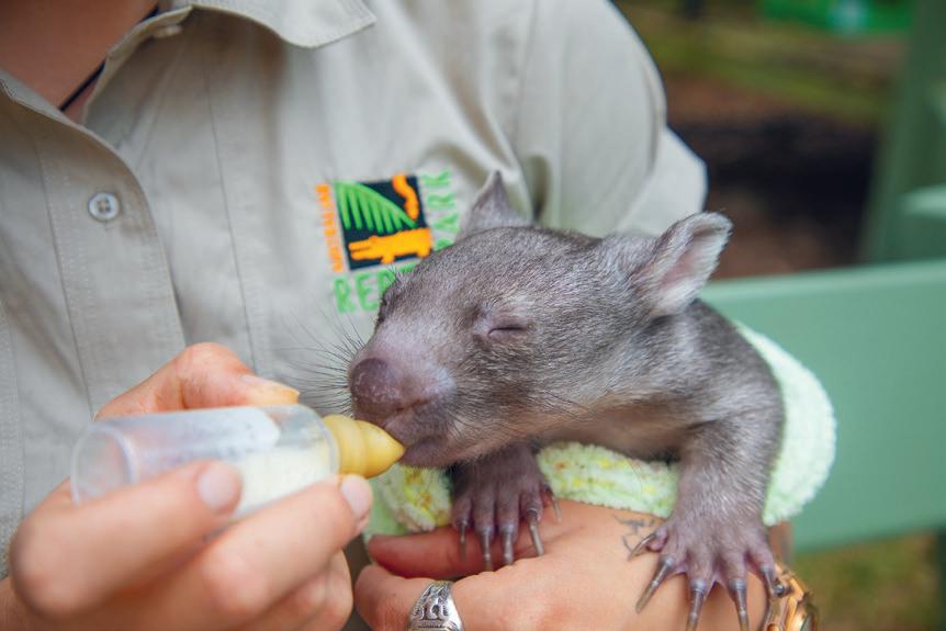 His feeding times coincide with another Reptile Park joey, Albert, and they have become firm friends. What they don’t seem to realise though, as they feast on their bottles side by side, is that Albert is a tree-hugging koala, while Wilbur is very much a ground-hugging wombat! It’s confusing having a dinner mate who’s also a grey furry marsupial … but different.
