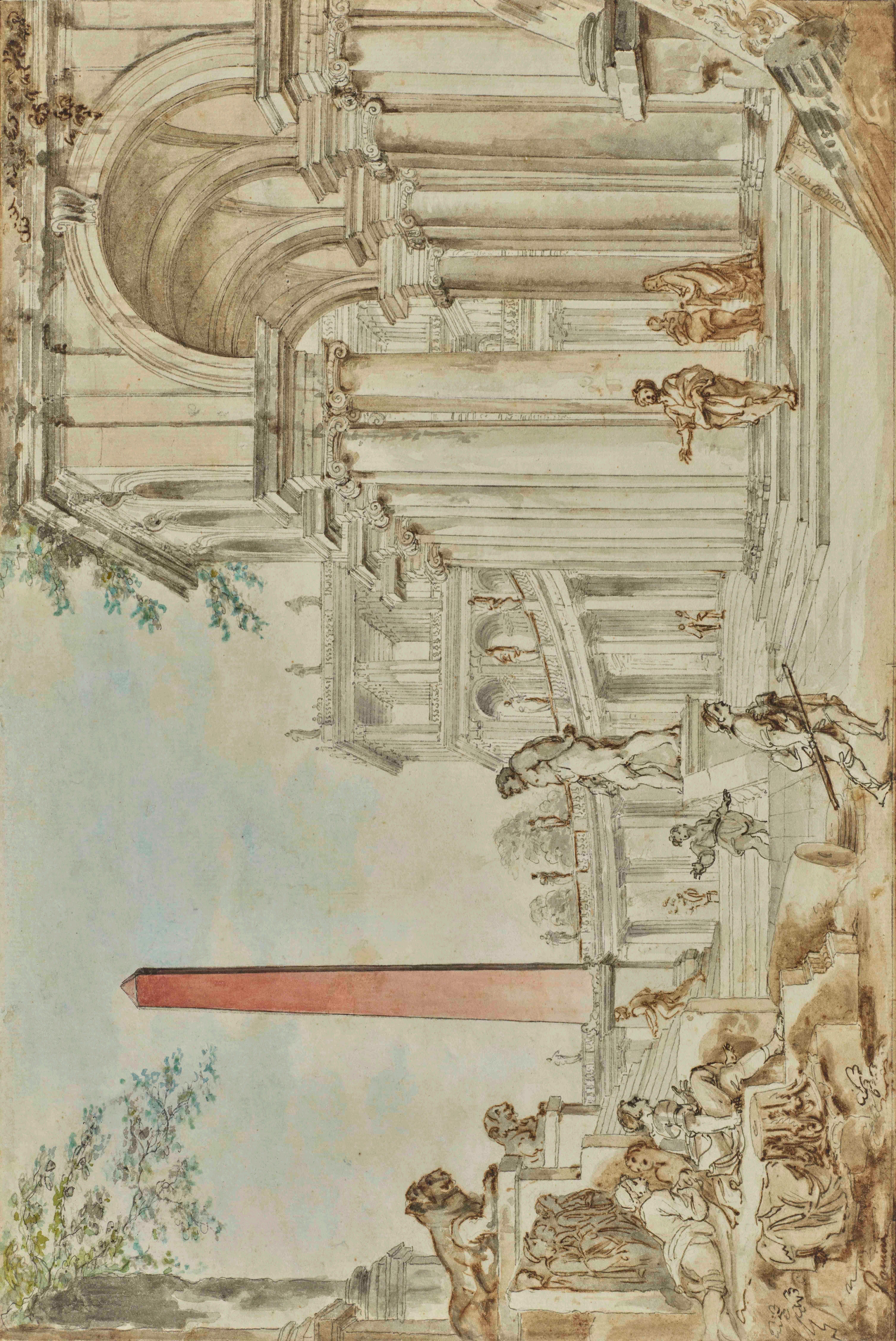 Ce dessin est une copie d’après une feuille de Gian Paolo Panini (1691-1765) ayant appartenu à Pierre-Jean Mariette (fig.1). À partir de 1759, Natoire envoie régulièrement des dessins de Panini aux amateurs parisiens. Ainsi en 1761, il adresse à Marigny un « petit paquet qui contient deux desseins que M. Panniny (lui) a remis pour M. Mariette » (Correspondance des Directeurs de l’Académie de France à Rome avec les surintendants des Bâtiments, publiée d’après les manuscrits des Archives Nationales par A. de Montaiglon et J.J. Guiffrey, Paris, 1887-1912, vol 11, p.389). Il est vraisemblable que le dessin de Panini faisait partie de l’un de ces envois et que Natoire l’ait copié avant de s’en séparer.