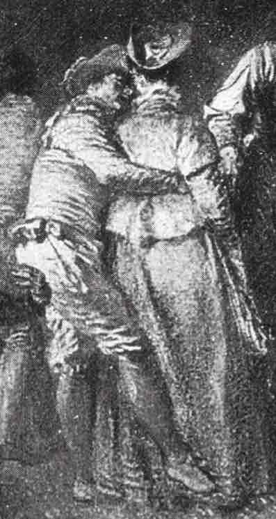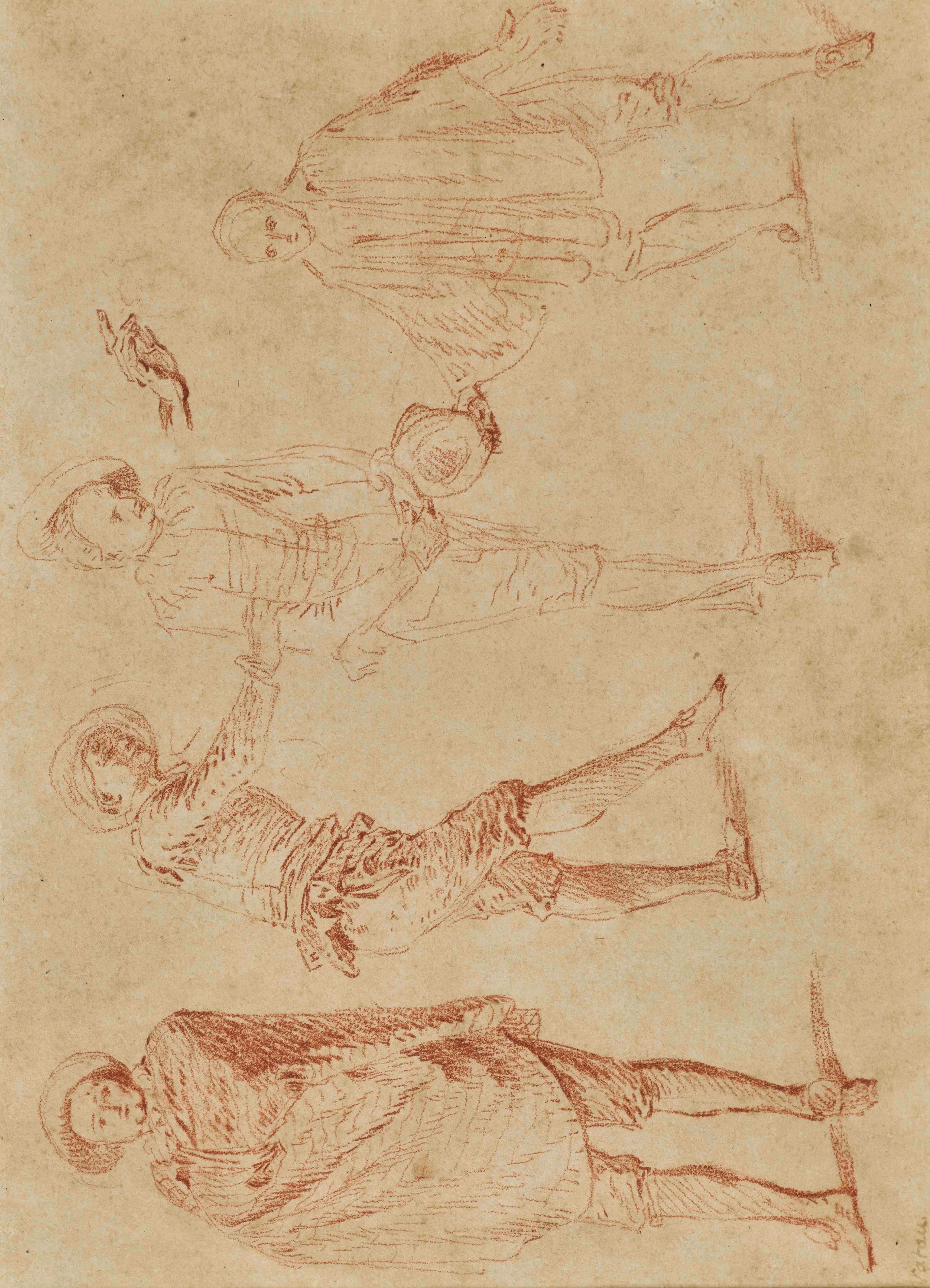 Ce dessin, qui représente plusieurs figures masculines esquissées dans des attitudes variées, illustre parfaitement la légèreté et la vivacité de son art, capturant subtilement gestes et mouvements. Les personnages, vêtus de costumes pittoresques, semblent engagés dans une petite scène silencieuse, faite de salutations, d’hésitations et de postures théâtrales. Certaines figures sont à rapprocher de tableaux de Watteau : la deuxième figure en partant de la gauche se trouve dans Le Contrat de Mariage au Prado (inv. P002353, détail fig.1) et le personnage de gauche, aux bras croisés se rapproche, en miroir, de l’homme se tenant sur la droite de L’Enchanteur du musée des Beaux-Arts de Troyes (inv. 835.15, détail fig.2).