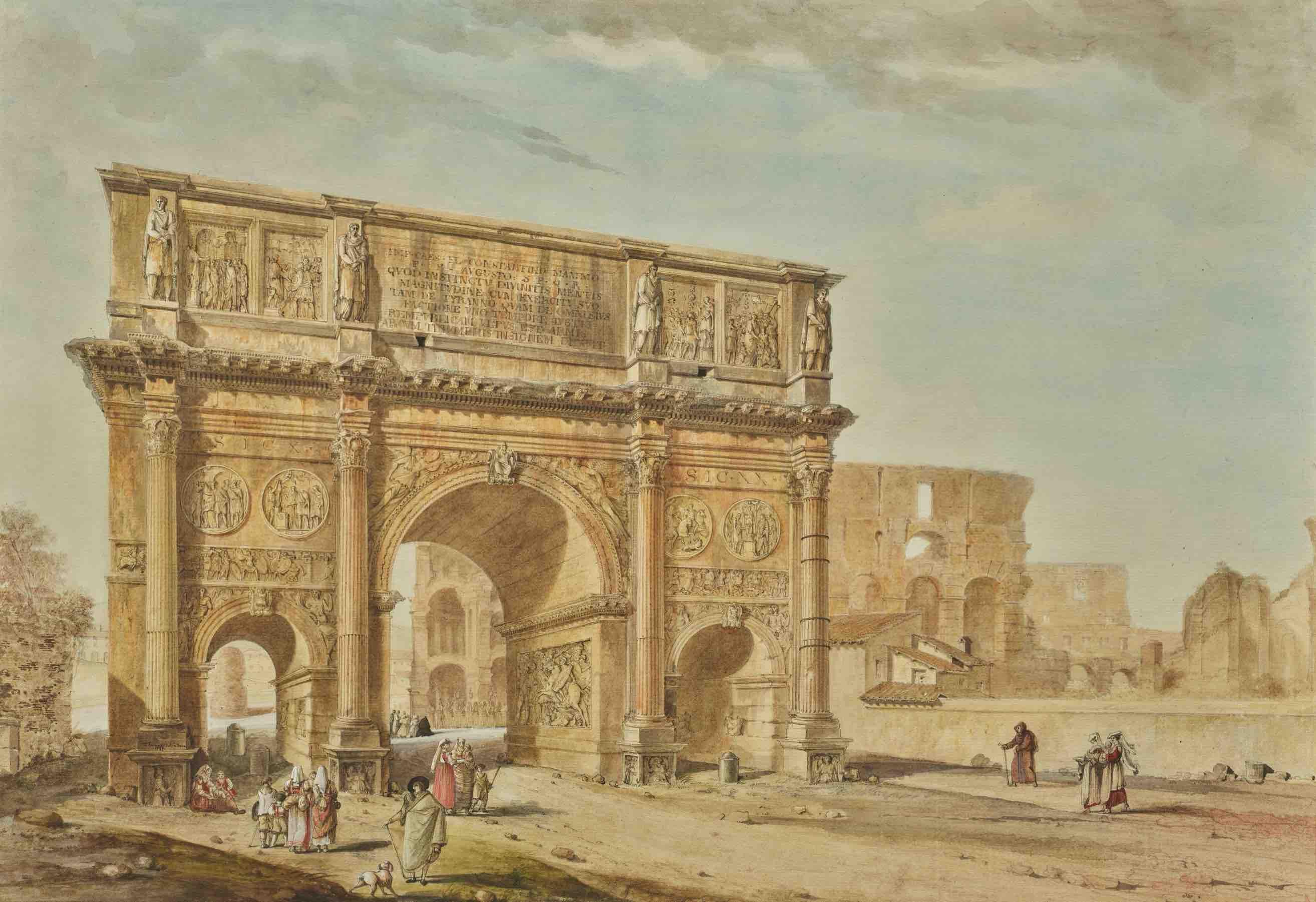 Cette aquarelle et son pendant (fig.1) contiennent toutes les qualités qui forgeront la reconnaissance de ce grand maître de la peinture d’architecture : la précision de la plume, la rigueur des détails des colonnes, des frontons et des bas-reliefs, la maîtrise de l’espace et de la perspective et la légèreté de l’aquarelle permettant la mise en majesté, ici, de deux monuments parmi les plus célèbres de Rome.