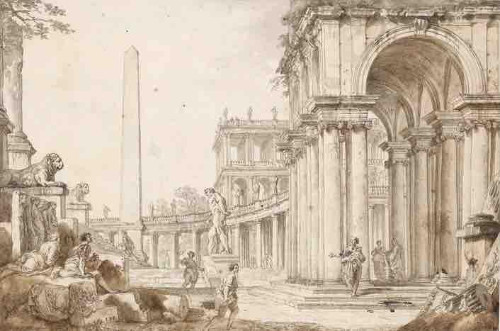 (fig.1) G. P Panini, Caprice architectural avec l’Hercule Farnèse , plume et encres brune et grise, lavis, rehaussé de blanc, H. 245 mm ; L. 370 mm