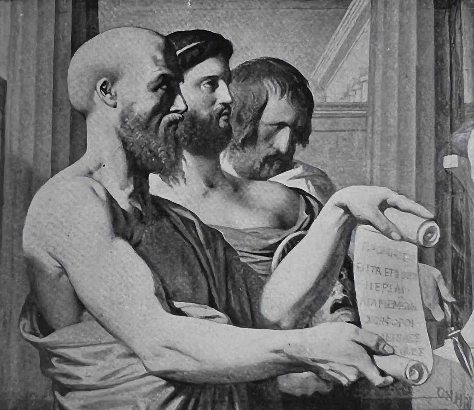 (fig. 2) Ingres, Les Trois tragiques Grecs, Eschyle, Sophocle et Euripide, 1866, n°324 du cat Wildenstein (fig. 120). Etude reprise et terminée quarante ans plus tard. Offerte par Ingres à Théophile Gautier