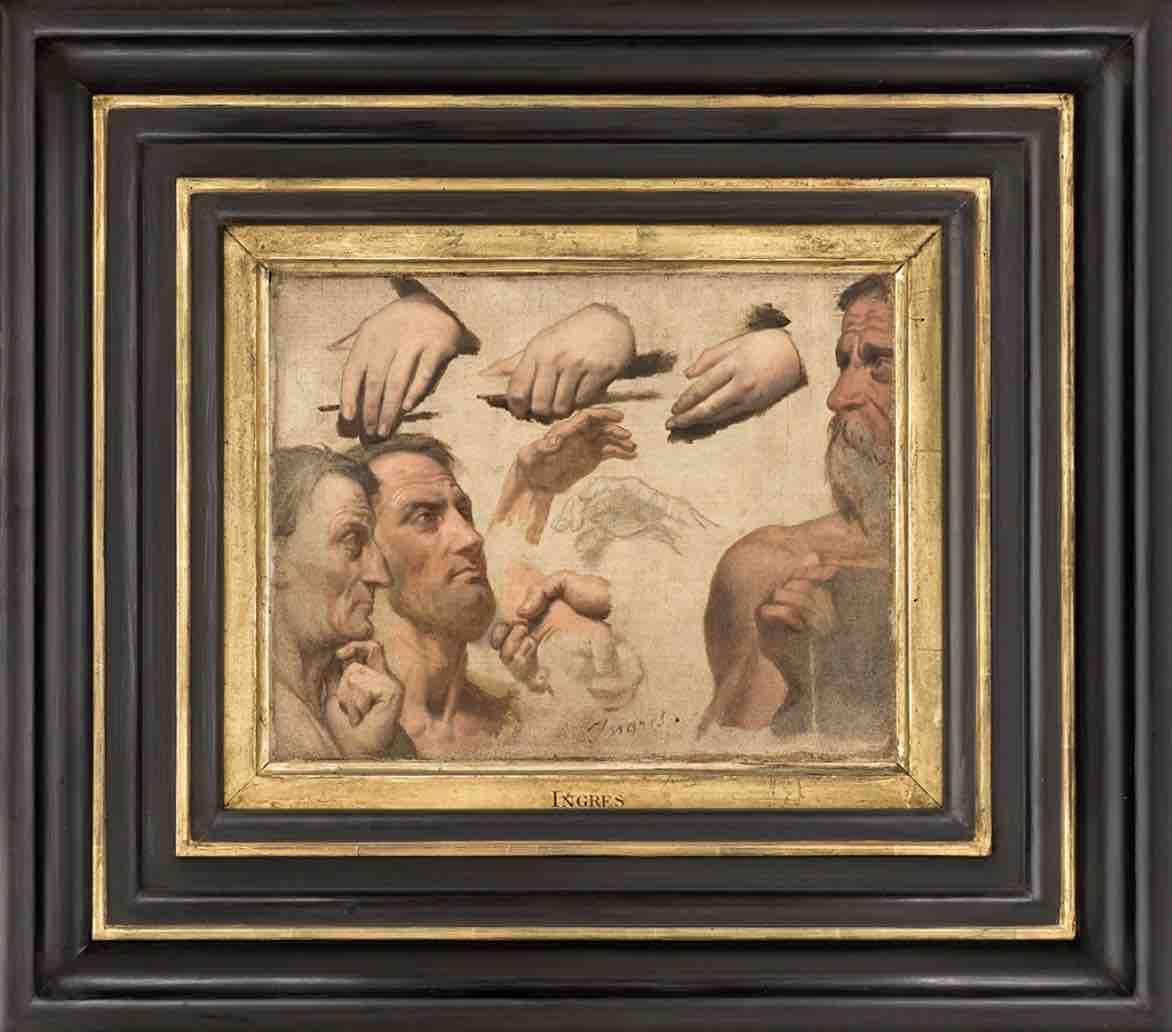Notre peinture est une étude pour la figure d’Eschyle représenté dans l’Apothéose d’Homère peinte par Ingres en 1827 pour décorer un des plafonds du musée Charles X aménagé par Percier et Fontaine au Louvre. Inspirée du Parnasse et de l’Ecole d’Athènes de Raphaël, la scène réunit autour de la figure divinisé d’Homère, des grands hommes de l’Antiquité et des artistes des temps modernes qui lui rendent hommage. Le projet est explicite : placer le modèle classique au-dessus de tous les autres. Ingres réalisa plus d’une centaine d’études pour travailler aux détails de son œuvre et s’immiscer à la hauteur du génie de Raphaël. Celles-ci sont conservées pour partie dans différents musées tels que le Louvre, les musées Bonnat de Bayonne et Ingres de Montauban, la National Gallery of Art de Washington… Peu de temps avant sa mort, soucieux d’organiser sa succession, Ingres vendit au marchand Etienne-François Haro (1827-1897), 31 études peintes et plus de 40 dessins pour liquider son atelier. Parmi les études figuraient des fragments découpés, parfois rassemblés dans des collages, qui furent uniformément encadrés d’or et de noir, couleur du deuil. Notre œuvre présente ce modèle unique de cadre conçu pour la succession et dont le musée de Montpellier conserve un exemplaire pour une étude de Têtes et mains (fig.1).