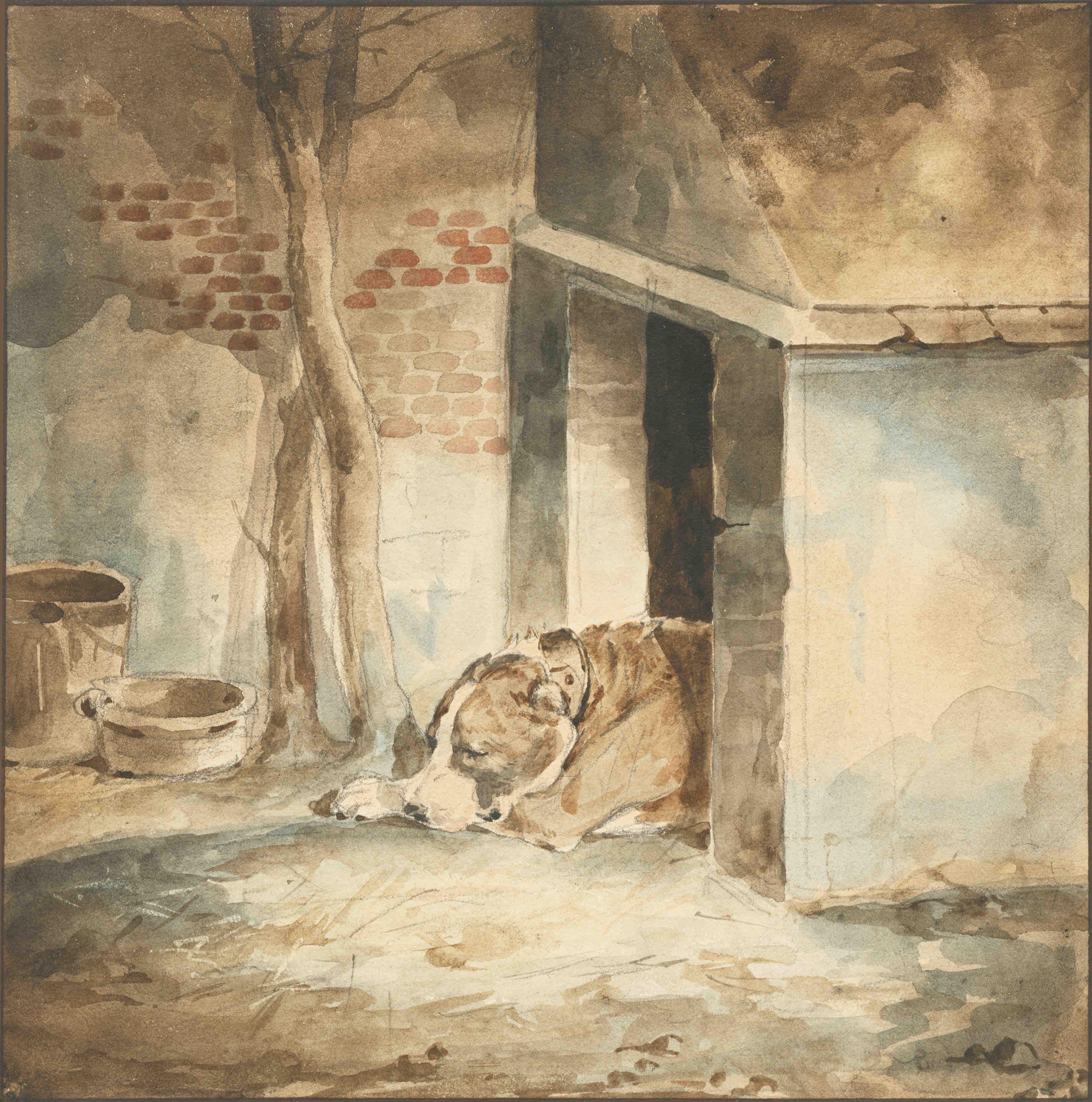 Cette aquarelle de Théodore Géricault représente son chien couché à l’entrée de sa niche, la tête posée sur ses pattes, semblant sommeiller dans une attitude de calme mélancolie. Le décor sobre confère à la scène une atmosphère intime et silencieuse. Le chien, de race mâtin, serait Galaor, compagnon fidèle de l’artiste qui lui aurait donné ce nom avec une pointe d’ironie, en référence au comte d’Artois, futur Charles X, qui portait ce surnom dans sa jeunesse. Cette œuvre traduit la solitude et la fidélité silencieuse de l’animal, miroir probable du tempérament de son maître. On peut la rapprocher d’un croquis conservé à l’Art Institute de Chicago, représentant le même chien dans une attitude semblable, issu d’un carnet daté des années 1818-1819 (fig.1). (fig.1)