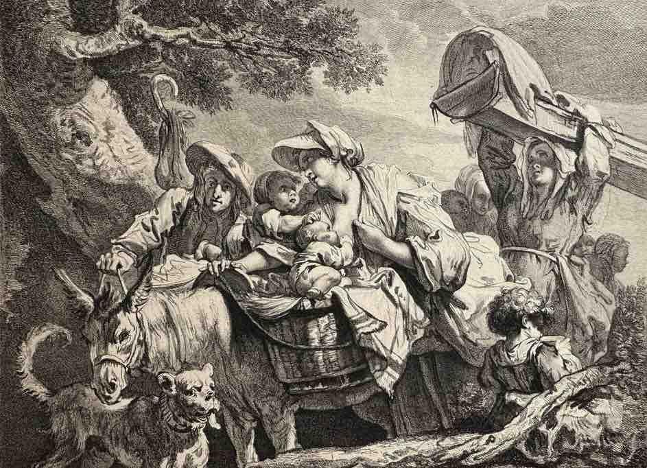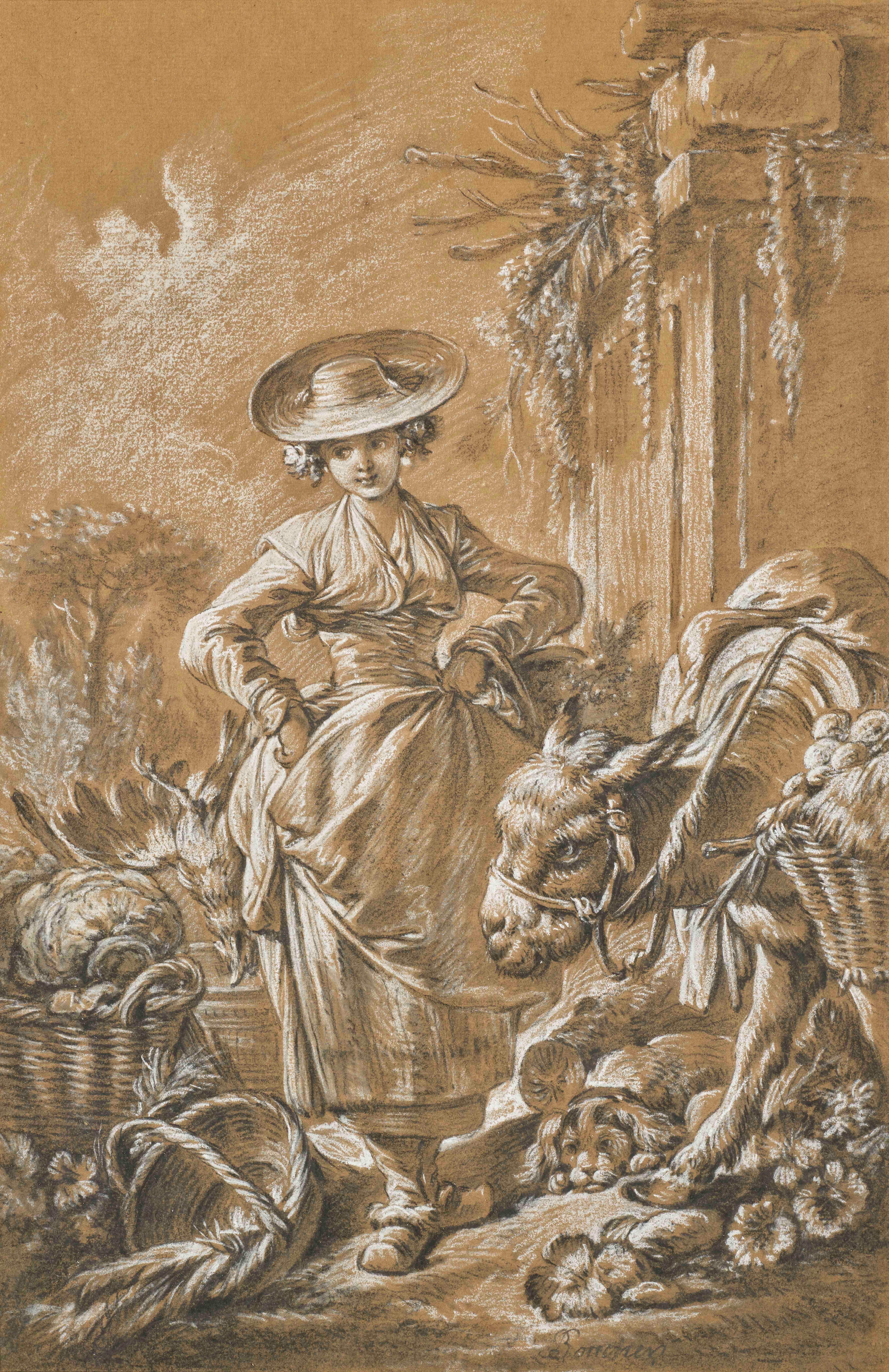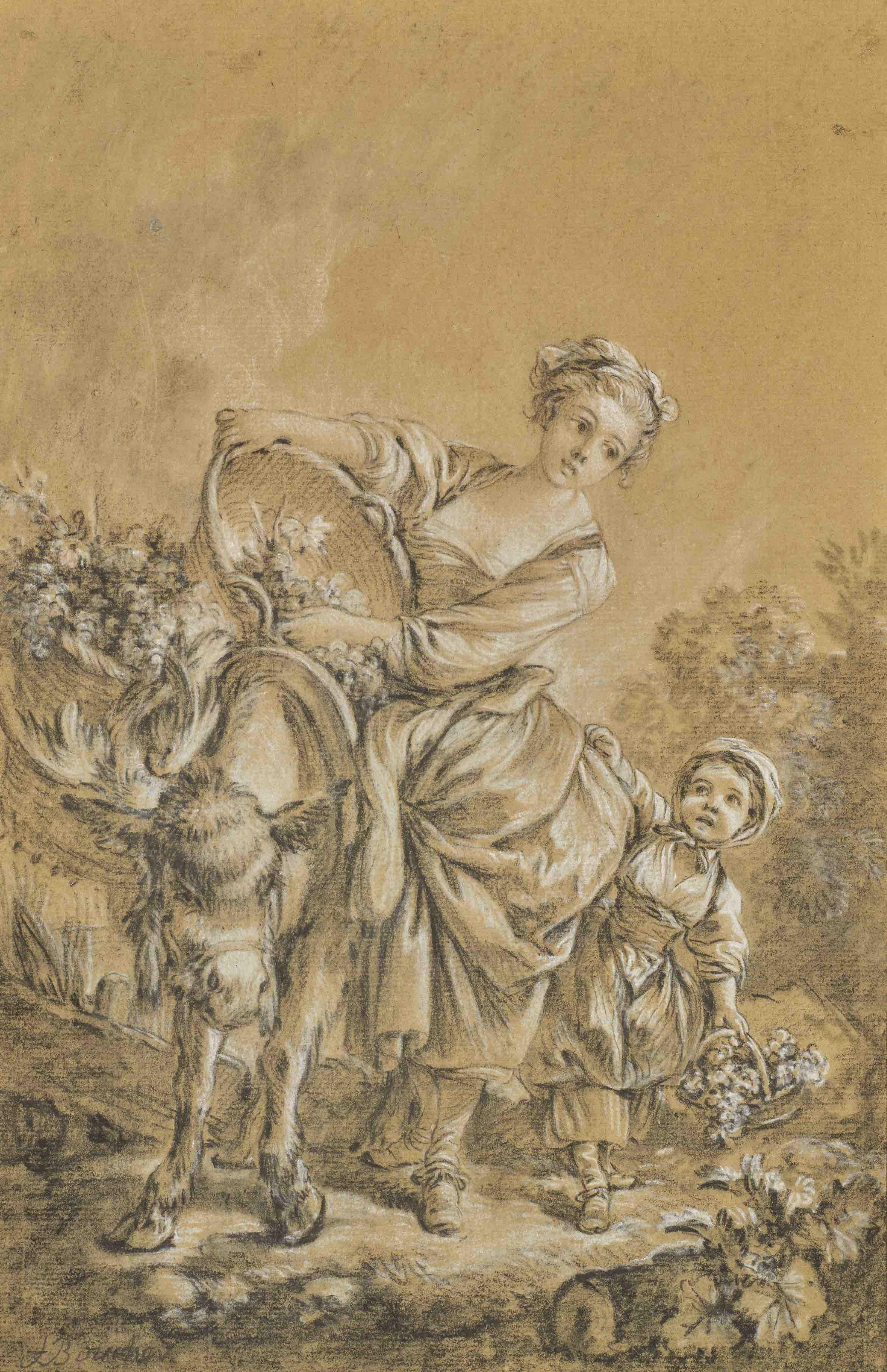 (fig.1) F. Boucher, Une jardinière et sa fille chargeant un âne de fleurs, pierre noire, estompe et rehauts de craie blanche, H. 395 ; L. 258 mm, Paris, collection particulière