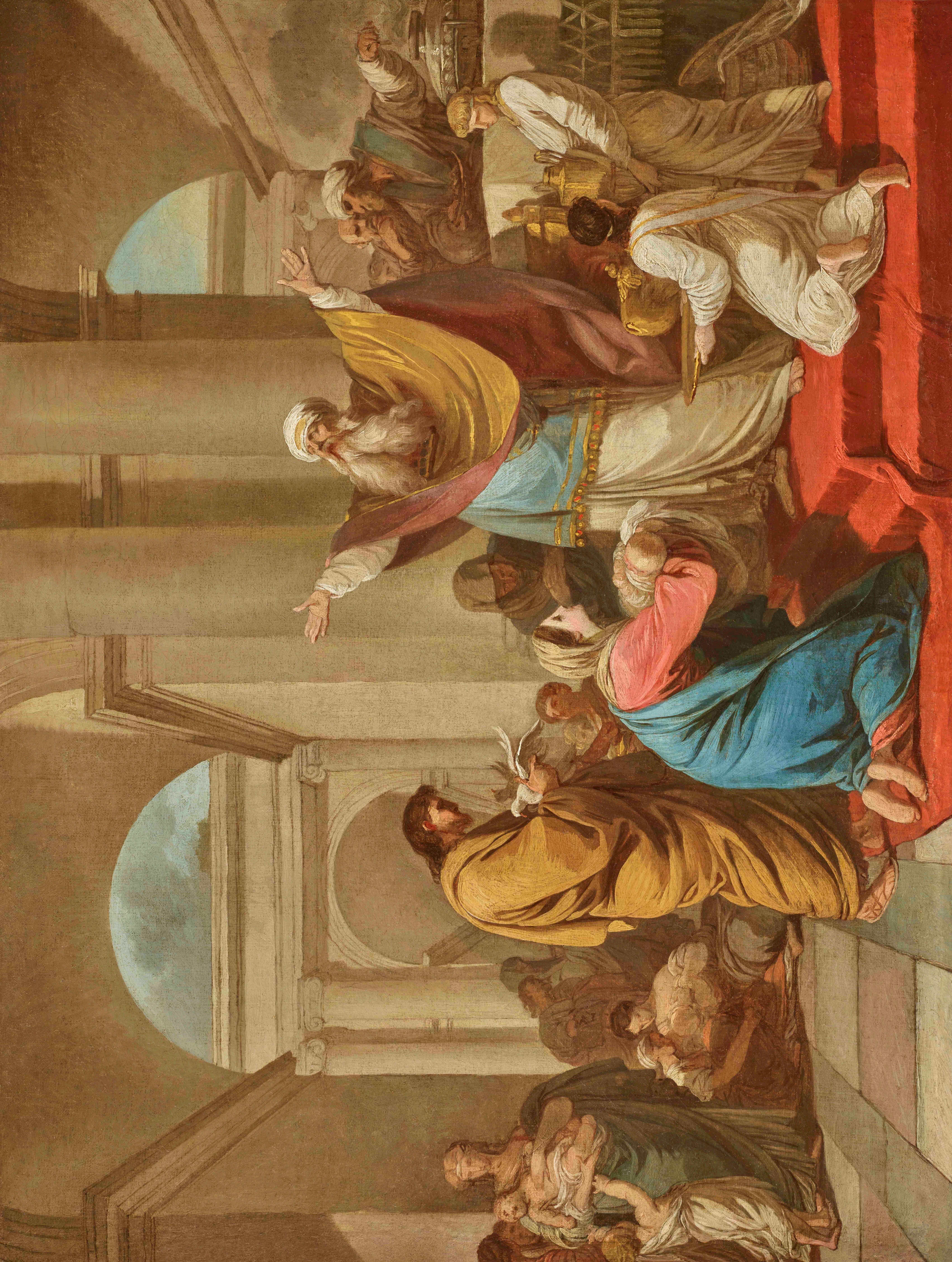 Notre modello représente La Présentation de Jésus au temple commandée dès 1771 pour compléter le cycle de la Vie de la Vierge pour la chapelle Notre-Dame-de-Thuyne de l’église des Récollets à Ypres, mais achevée seulement en 1776