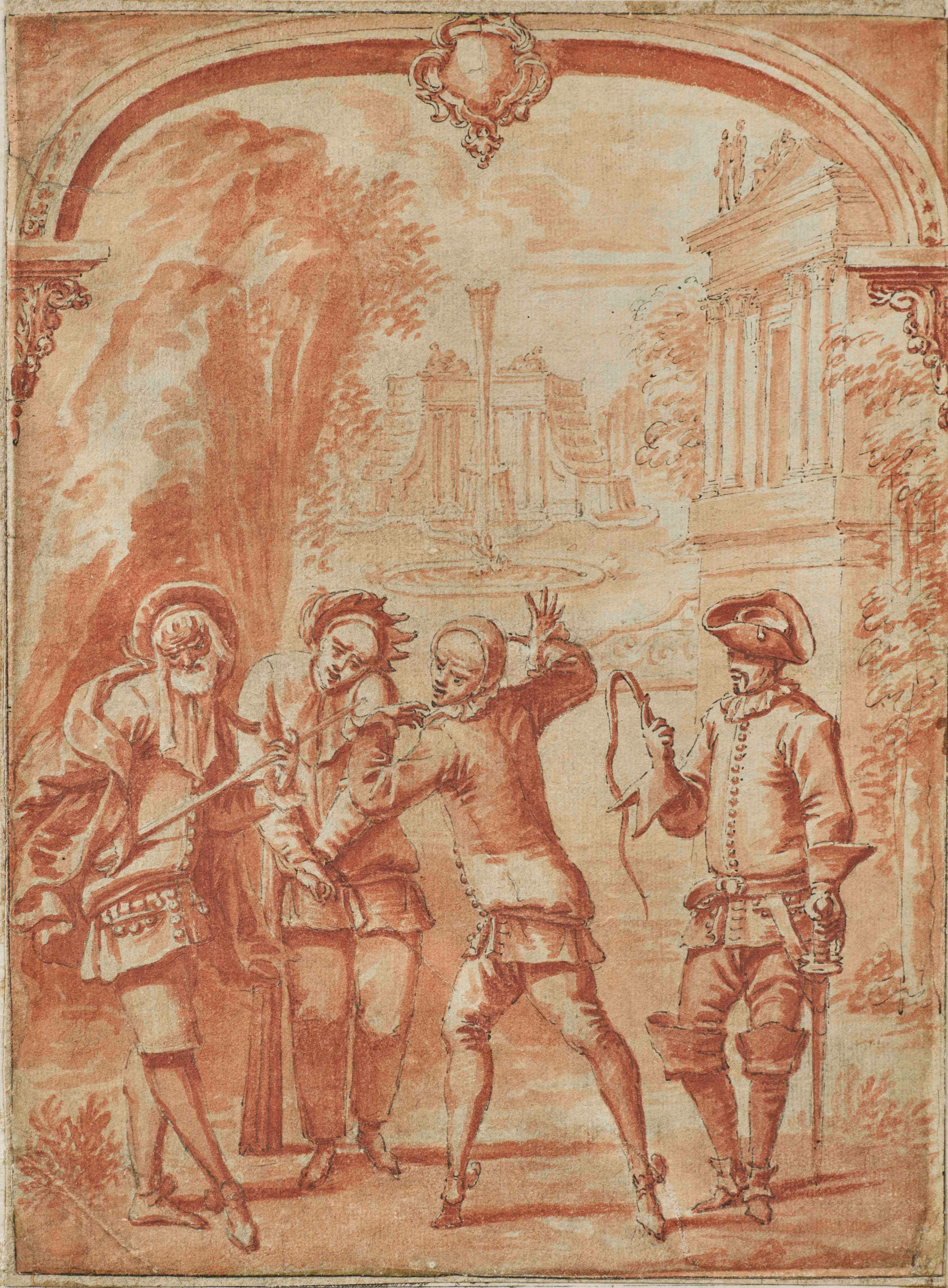 La composition ambitieuse montre quatre acteurs en costume devant un fond de paysage mêlant rochers, façade à colonnes et fronton, fontaine à degrés et un arc surbaissé, orné en son centre d’un cartouche rocaille, qui pourrait être un projet, non retenu, de frontispice On retrouve le lavis rose typique de notre artiste. Son style vif et nerveux témoigne d’une main sûre et d’un goût pour le mouvement et l’expression. S’il n’a pas été possible d’identifier formellement la scène représentée, on retrouve les prémices de l’esprit rococo, où le divertissement, la légèreté et le jeu des masques tiennent une place centrale.